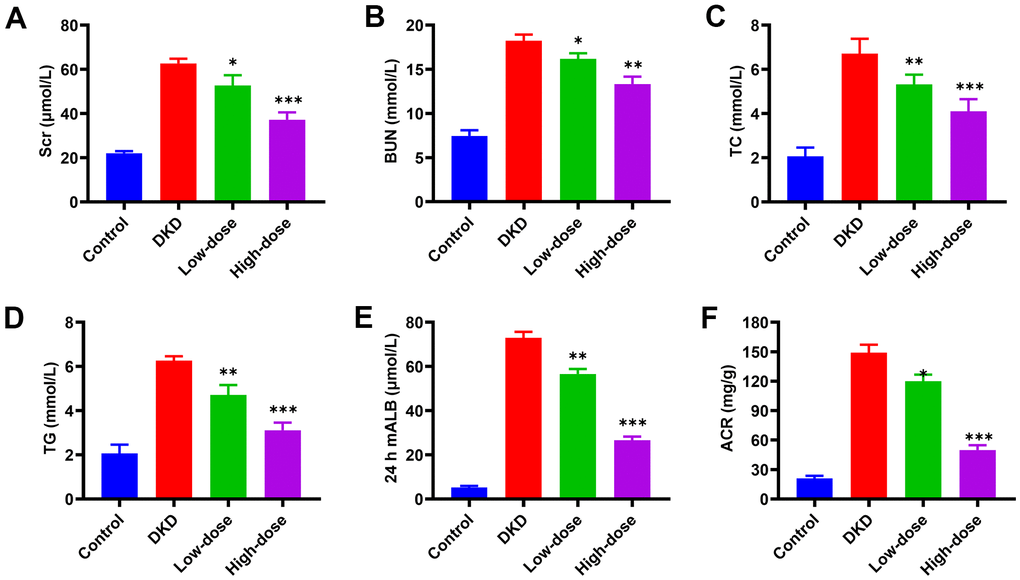 Compared to control group, STZ injection significantly impaired kidney function in rats, evidenced by the increased biomarkers in the serum, including serum creatinine (sCr) (Figure 2A), blood urea nitrogen (BUN) (Figure 2B), total cholesterol (TC) (Figure 2C) and triglyceride (TG) (Figure 2D), and the upregulated biomarkers in the urine, such as albumin-to-creatinine ratio (ACR) (Figure 2E) and 24 h microalbumin (24 h mALB) (Figure 2F). All these biomarkers could be dose-dependently reduced by Qidantang Granule in DKD rats.