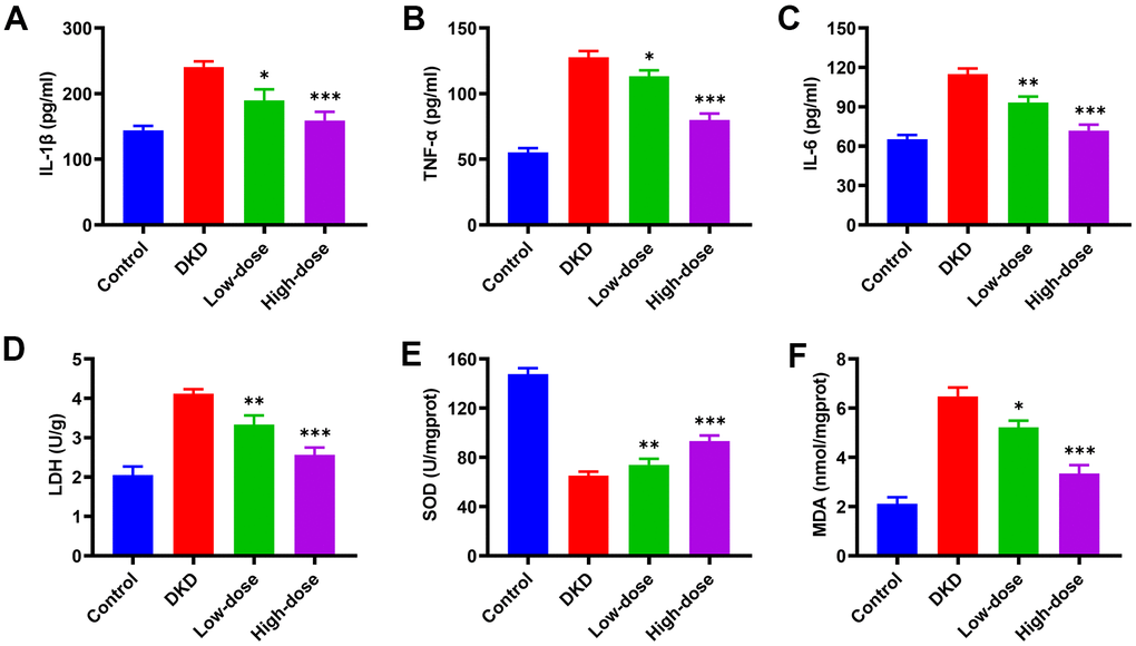 Next, we evaluated the effect of Qidantang Granule on inflammation and oxidative stress in DKD rats. DKD rats displayed increased secretions of inflammatory factors in the serum, including IL-1β (Figure 3A), TNF-α (Figure 3B) and IL-6 (Figure 3C), which indicated the inflammation was activated in DKD rats. Activated inflammation was significantly reduced by Qidantang Granule in a dose-dependent way. Furthermore, compared to control group, STZ injection induced oxidative stress in rats, as evidenced by the increased levels of LDH (Figure 3D) and MDA (Figure 3E) as well as decreased SOD (Figure 3F), and all of which could be dose-dependently restored by Qidantang Granule. These data suggested that Qidantang Granule attenuated inflammation and oxidative stress in DKD rats.