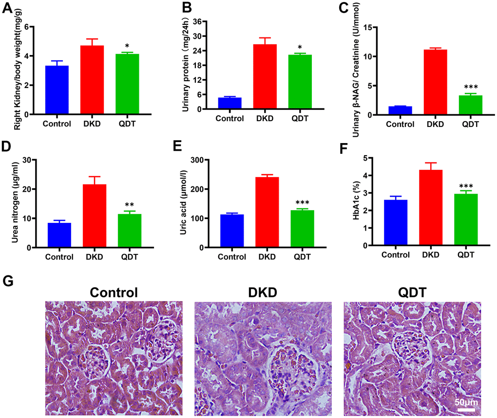 Because the high dose (200 mg/kg) of Qidantang granule had a better protective effect on the kidney than the low dose (50 mg/kg), we chose the high dose for the following studies. Compared to control group, DKD rats displayed severe renal injury. All the biomarkers of renal injury in the urine were remarkably upregulated in DKD rats, including right kidney/body weight (Figure 4A), urine protein of 24 h (Figure 4B), urinary β-NAG/urinary creatinine (Figure 4C), serum urea nitrogen (Figure 4D), serum uric acid (Figure 4E), HbAc1 (Figure 4F). In addition, H&E staining showed that Qidantang Granule could attenuate renal damage in DKD rats (Figure 4G). Qidantang Granule significantly reduced all these biomarkers of renal injury, which suggested that Qidantang Granule significantly alleviated renal injury in DKD rats. Moreover, rats with insulin treatment had significant lower serum urea nitrogen, serum uric acid, and serum creatinine than DKD rats (Supplementary Figure 2A–2C), indicating that STZ-induced kidney damage was associated with pancreatic β-cell damage.