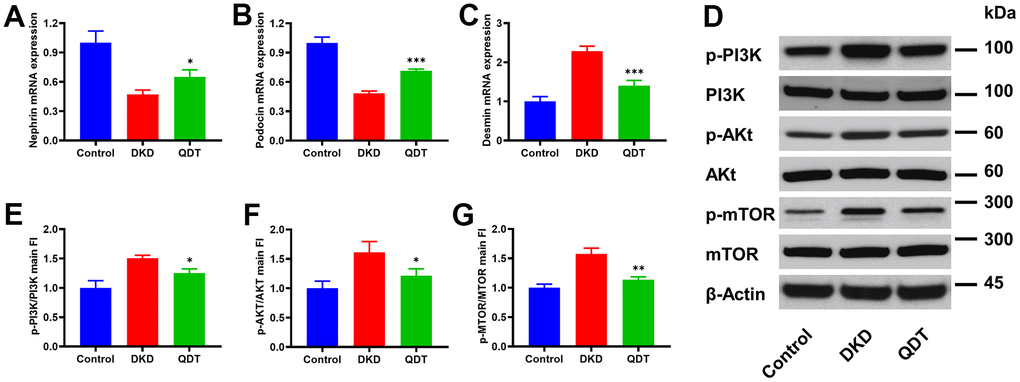 Next, we explored the detailed mechanism of its protective effect on DKD. We observed that mRNA levels of podocytes markers, such as nephrin (Figure 5A) and podocin (Figure 5B), were reduced with the increased mRNA level of muscle marker, desmin (Figure 5C), which suggested that podocytes were reduced in the kidney of DKD rats and restored by high dose of Qidantang Granule. Moreover, DKD activated PI3K signaling pathway in the kidney, as reflected by the increased protein levels of p-PI3k, p-AKT, and p-mTOR, were significantly restored by Qidantang Granule (Figure 5D–5G). These data indicated that Qidantang Granule ameliorated podocytes and renal injury by inhibiting PI3K/Akt/mTOR signaling pathway in DKD rats.