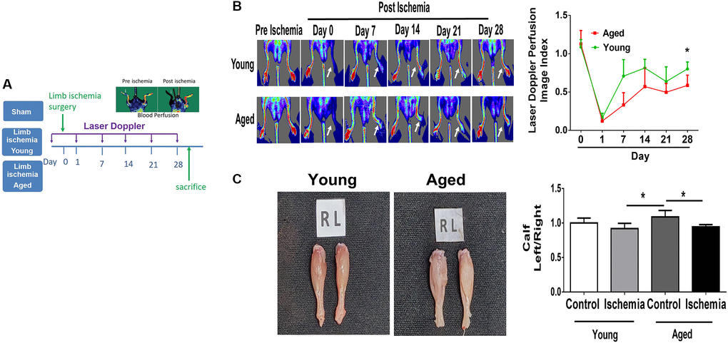 17 Young (10-week-old) and aged (80–100-week-old) mice were randomly assigned to (1) control young group, (2) control aged group, (3) young hindlimb ischemia group, (4) aged hindlimb ischemia group. As described previously, a model of hindlimb ischemia were established in the left hind limbs of mice [12, 33]. Briefly, mice were anesthetized with an intraperitoneal injection of pentobarbital (80 mg/kg). The left femoral vein and artery were exposed through a transverse skin incision. The femoral vein and artery were ligated with 6–0 silk. The segment of vessels between the two ligations were excised. The mice of control group received sham surgery, in which the femoral artery and vein were exposed similar to the method above without ligation or excision, were performed on the contralateral leg. The detailed experimental design is shown in Supplementary Figure 5.