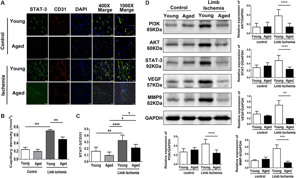 Using laser Doppler imaging (LDI), we found that compared with young mice (10-week-old), aged mice (80-100-week-old) presented with impaired angiogenesis after hindlimb ischemia surgery (Figure 1A, 1B). Additionally, at the end of the experiment, the weights of the harvested limbs were measured. In young mice, the muscle weight of the ischemic limb was only slightly reduced, but in aged mice, there was a significant reduction in the weight of the ischemic limb compared with the nonischemic limb (Figure 1C). Following 28 days of hindlimb ischemic surgery, in young mice, hindlimb ischemia surgery triggered a significant increase in capillary density, as shown by staining with CD31, a marker specific for capillaries, but in aged mice, the augmented capillary density was attenuated (Figure 2A, 2B). Additionally, we found that expressions of STAT3 were increased on CD31 positive cell of young mice but decreased on that of aged mice (Figure 2A, 2C). The expression of STAT3 and proliferation-associated proteins, including PI3K, AKT, VEGF and MMP9 [5, 6, 9, 10], was measured in the hindlimb muscles by western blot. Interestingly, we found that limb ischemic surgery activated the expression of STAT3 and the abovementioned markers for proliferation in young mice but not in aged mice (Figure 2D). In order to confirm the expression of MMP9 and VEGF in endothelial cells, the endothelial cells were double stained with CD31 and MMP9 or CD31 and VEGF. Both in young and aged mice, immunofluorescence studies revealed that the expression of MMP9 and VEFGF in CD31 expressing endothelial cells (Supplementary Figure 1A, 1B). After ischemic surgery, hindlimb ischemia surgery triggered a significant increase MMP9 and VEGF expression in endothelial cell of young mice. Compared to young mice, the MMP9 and VEGF expression were significantly decreased in endothelial cell of aged mice after hindlimb ischemia surgery.