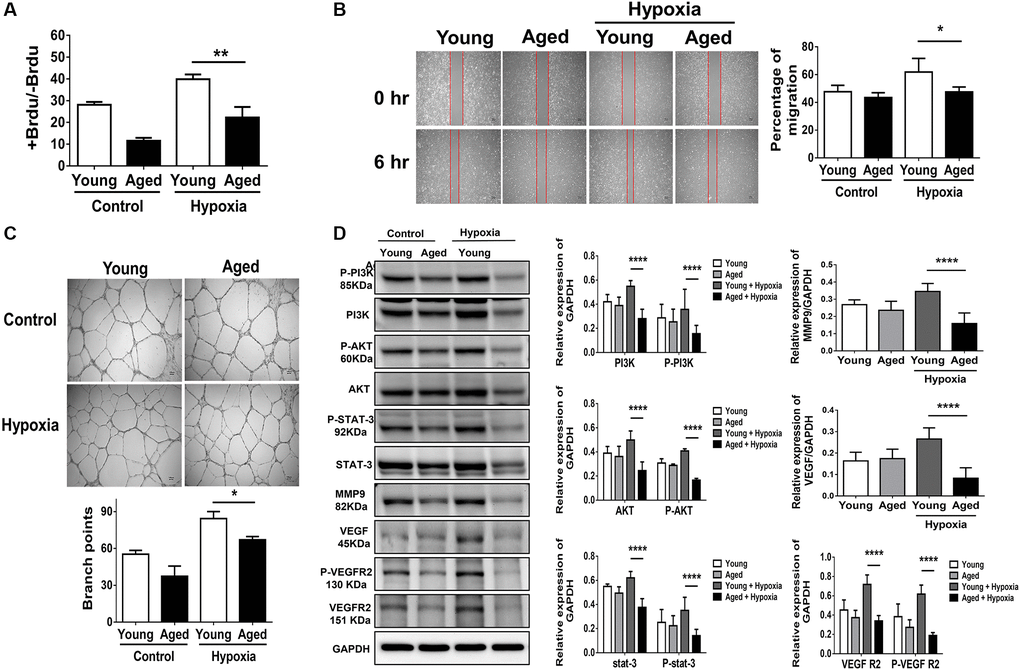 To establish a cellular model mimicking aged capillaries, HUVECs sub-cultured to achieve more than 30 passages were defined as aged cells compared with those within ten passages, defined as young cells [11]. To provide evidence regarding the aging process in these cells, β-galactosidase, an extensively utilized biomarker for the detection of cellular senescence, and p16, p21, and hTERT genes involved in DNA damage and senescence were measured [11]. The aged cells showed a significant accumulation of β-galactosidase and high expression of aging-associated genes (Supplementary Figure 2). After hypoxia stimulation, proliferation, migration and tube formation were, at least in part, augmented in young HUVECs. In contrast, hypoxia-triggered proliferation, migration and tube formation were significantly attenuated in aged HUVECs (Figure 3A–3C). Notably, compared with significant increases in the protein expression of P-STAT3 and the proliferation-associated proteins (e.g., P-PI3K and P-AKT) as well as angiogenesis-associated proteins including VEGF, VEGF receptor 2 (VEGFR2), P- VEGFR2 and MMP9 in young HUVECs post hypoxia, hypoxia-activated protein expression was significantly reduced in aged HUVECs (Figure 3D).