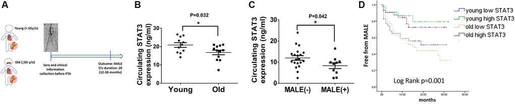 In this study, we found that among patients with PAD, generally, old patients expressed a lower level of circulating STAT3 than younger patients. Notably, low STAT3 expression was positively correlated with the subsequent development of MALEs, including limb loss or repeated interventions. Likewise, the aged mice expressed significantly lower angiogenesis and tissue-specific STAT3 expression than the young mice 28 days post hindlimb hypoxic/ischemic surgery. After 24 hours of hypoxia, along with low STAT3 expression, proliferation, migration and tube formation were significantly impaired in aged HUVECs compared with young HUVECs. Furthermore, we found that suppressing STAT3 expression attenuated the proliferation, migration and tube formation capabilities of HUVECs under hypoxia. A summary of our findings is illustrated in Graphic abstract.