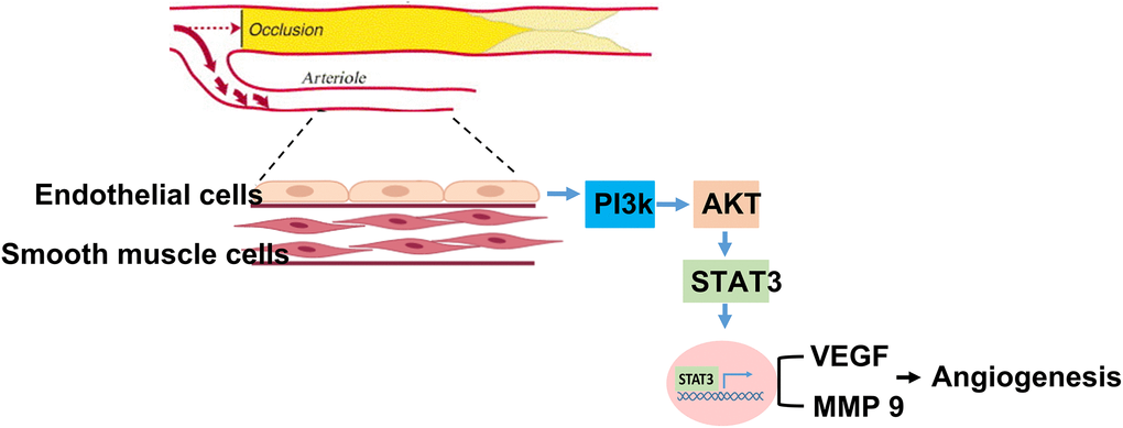 Biomarkers are frequently used in clinical practices for diagnosis and risk stratification [23]. In patients with PAD, biomarkers facilitate physicians in identifying high-risk populations who may have poor outcomes in limb salvage [24]. Through a systemic review focusing on 21473 PAD patients, Kremers et al. found that high-sensitivity CRP levels had a 1.86 fold risk for MALEs [25]. However, other biomarkers, including fibrinogen, D-dimer, N-terminal pro-B-type natriuretic peptide and high-sensitivity cardiac troponin T, were only associated with the risk of mortality instead of the risk of MALE [25]. Thus, an optimal biomarker for determining the risk for progression and the response to therapy is lacking. Most importantly, the biomarker should pathologically explain its role in mitigating blood flow insufficiency in limb ischemia. Herein, among 216 patients receiving PTA for PAD, we observed that low expression of circulating STAT, especially in older patients, was significantly associated with the occurrence of MALEs. Additionally, in a rat model of hindlimb ischemia, aged mice had significantly low angiogenesis accompanied by low muscular expression of STAT3. Further, in aged HUVECs, proliferation, migration and tube formation were significantly impaired compared with young cells after hypoxia stimulation. Mechanistically, suppressing the expression of STAT3 causes HUVECs to lose their angiogenesis capability. Collectively, our findings pave the way toward pharmacological intervention targeting STAT3 activity to improve angiogenesis in patients with PAD.