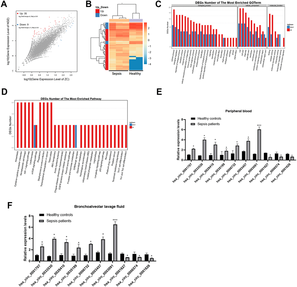 First, we collected clinical blood samples from sepsis patients (n=3) and healthy controls (n=2) and performed transcriptomic profiling to identify deregulated circRNAs. A total of 44 circRNAs were differentially expressed (35 upregulated and 9 downregulated) between sepsis patients and healthy subjects (Figure 1A, 1B).