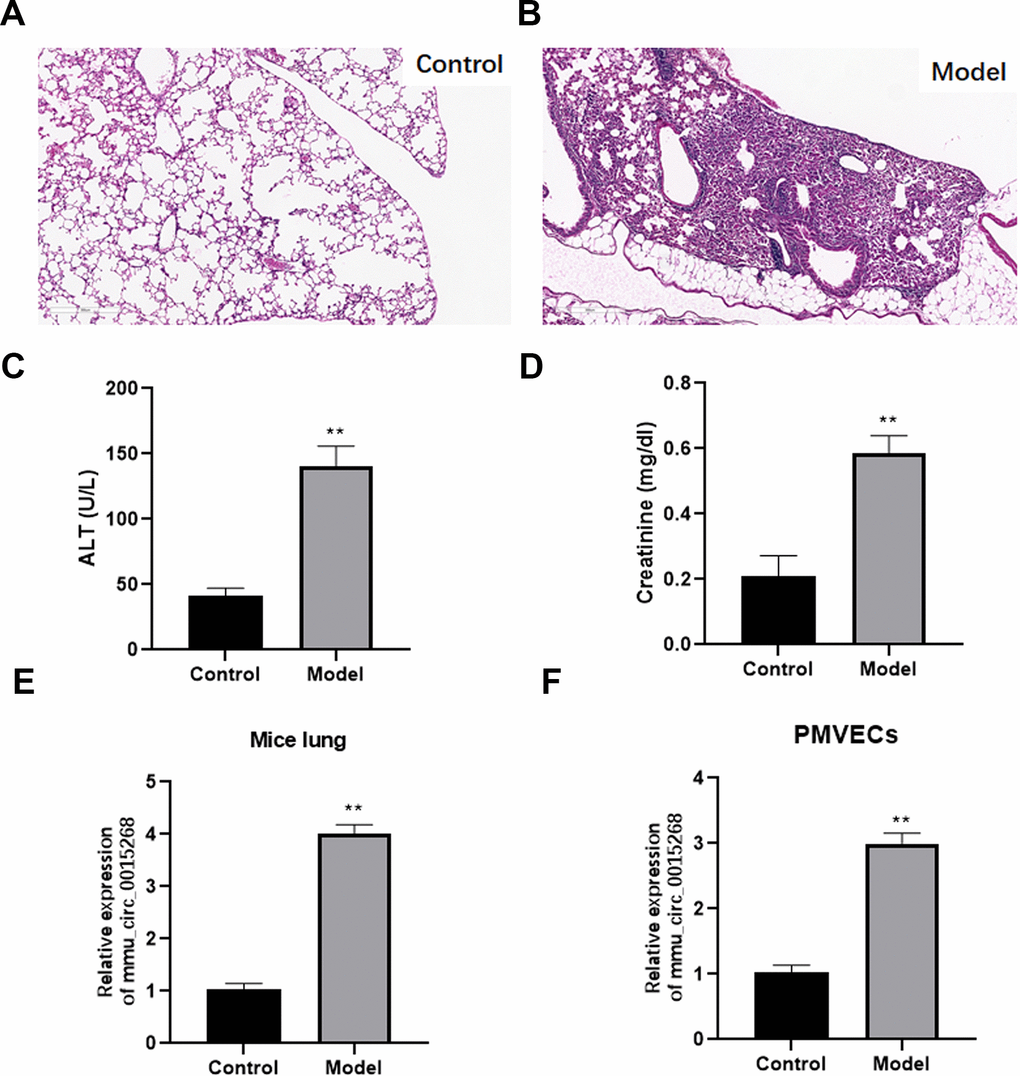To explore the effects of has_circ_0003091 (mmu_circ_0015268) in endothelial cell dysfunction and pulmonary vascular injury, its expression was determined in the lung and lung EC tissues from LPS-induced ALI mice. The histological analysis showed that sepsis led to pulmonary injury (Figure 2A, 2B). Additionally, the levels of hepatic injury (ALT activity) and renal injury (creatinine concentration) markers were dramatically increased in sepsis mice compared to healthy controls (Figure 2C, 2D). These data indicated the successful establishment of the sepsis model. Compared to the lung tissues of healthy mice, ALI mice presented enhanced expression of has_circ_0003091 (Figure 2E). Meanwhile, we also observed significantly elevated expression of has_circ_0003091 in LPS-treated primary murine pulmonary microvascular endothelial cells (PMVECs) compared to untreated cells (Figure 2F). Altogether, these results showed that LPS induction significantly enhanced the expression of has_circ_0003091 in the lung and lung ECs tissues of ALI mice.