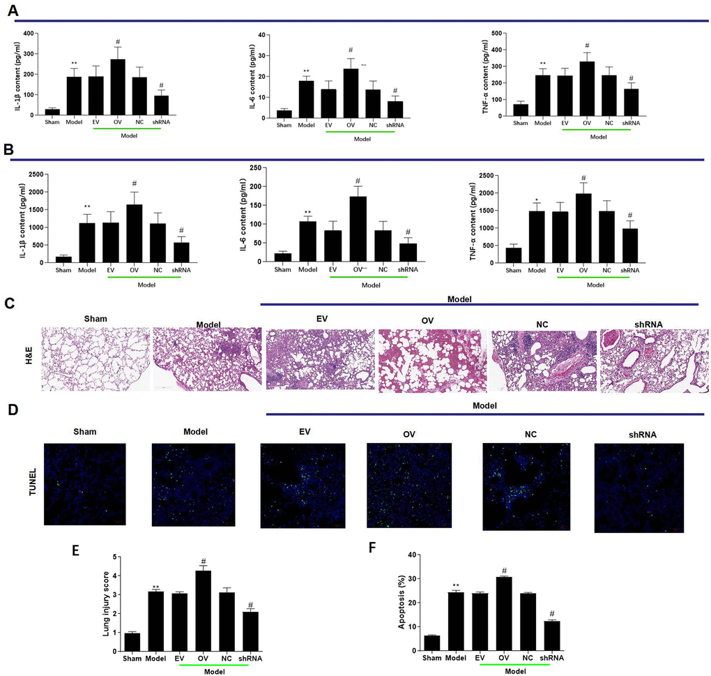 Changes in lung tissue morphology were determined using H&E staining. Briefly, lung tissue sections were stained with H&E following a routine protocol, and results were observed and recorded at 200 x magnification.