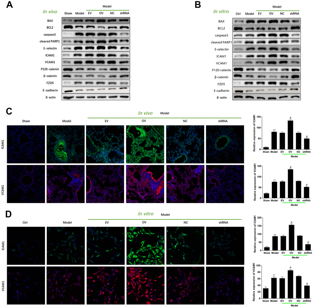 Lysis Buffer and BCA Protein Assay Kit from Thermo Fisher were employed to extract total protein and determine their concentrations, respectively. After separation using 10% SDS-PAGE, protein bands were transferred to the PVDF membrane. After 1 h of blocking with 5% non-fat milk, samples were incubated overnight with primary antibodies against BAX (1:1000, Abcam, Boston, MA, USA), BCL2 (1:1000, Abcam, Boston, MA, USA), Caspase3 (1:1000, Abcam, Boston, MA, USA), cleaved PARP1 (1:1000, Abcam, Boston, MA, USA), E-selectin (1:1000, Abcam, Boston, MA, USA), ICAM1 (1:1000, Abcam, Boston, MA, USA), VCAM1 (1:1000, Abcam, Boston, MA, USA), P120-catenin (1:1000, Abcam, Boston, MA, USA), β-catenin (1:1000, Abcam, Boston, MA, USA), and E-cadherin (1:1000, Abcam, Boston, MA, USA) at 4° C. Finally, samples were incubated for 1 h with HRP-conjugated secondary antibodies and the protein bands were analyzed.