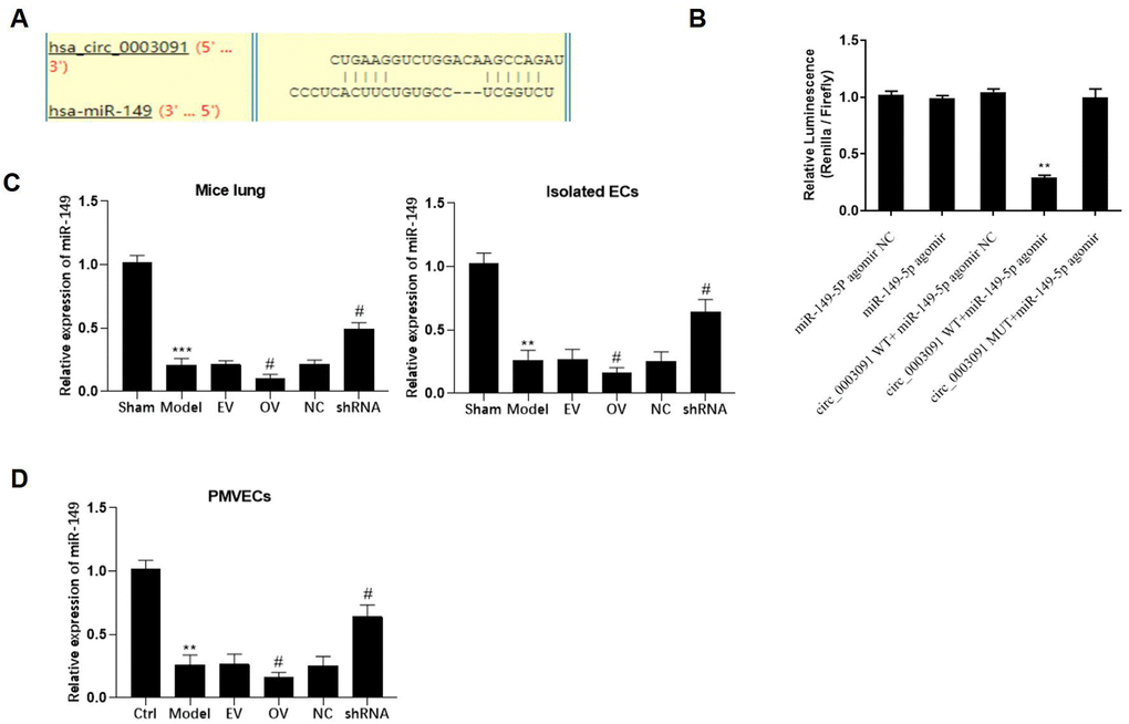 After bioinformatics analyses, miR-149 was identified as a potential target of has_circ_0003091 (Figure 5A). Compared to the mutant has_circ_0003091 cells, we observed significantly reduced luciferase activity in the miR-149 and WT has_circ_0003091 co-transfected cells (Figure 5B), suggesting the direct interaction between has_circ_0003091 and miR-149. Then, we examined the expression of miR-149 in lungs and PMVECs under ALI. The expression of miR-149 was significantly decreased in pathogenic lung tissues and LPS-stimulated PMVECs (Figure 5C). Compared to controls, has_circ_0003091 overexpression significantly impaired miR-149 expression in the mice’s lung tissues and isolated ECs (Figure 5C). Additionally, a negative correlation between miR-149 and has_circ_0003091 expression was observed in PMVECs (Figure 5D), consistent with the above results. Overall, these results suggested that has_circ_0003091 negatively regulates the expression of miR-149.