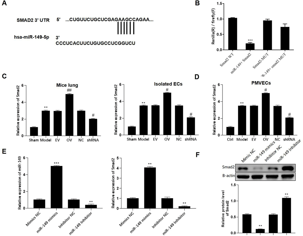 The putative binding site between miR-149 and Smad2 was found using the TargetScan database and indicated that has_circ_0003091 exerted its regulatory function by sponging miR-149 and subsequently affecting the Smad2 expression in sepsis-induced ALI (Figure 6A). Additionally, after miR-149 mimic transfection, only Smad2-WT cells exhibited significantly reduced luciferase activity. No luciferase activity changes were observed in the Smad2-MUT cells, suggesting direct Smad2 targeting by miR-140 (Figure 6B). In the animal model, the levels of Smad2 in the lung tissues and isolated ECs were elevated (Figure 6C). Moreover, mmu_circ_0015268 could positively regulate Smad2 expression (Figure 6D). By transfecting PMVECs with miR-149 mimics or inhibitors, the mRNA and protein levels of Smad2 were significantly decreased or elevated, respectively (Figure 6E, 6F). These findings revealed that Smad2 was a downstream target of miR-149.