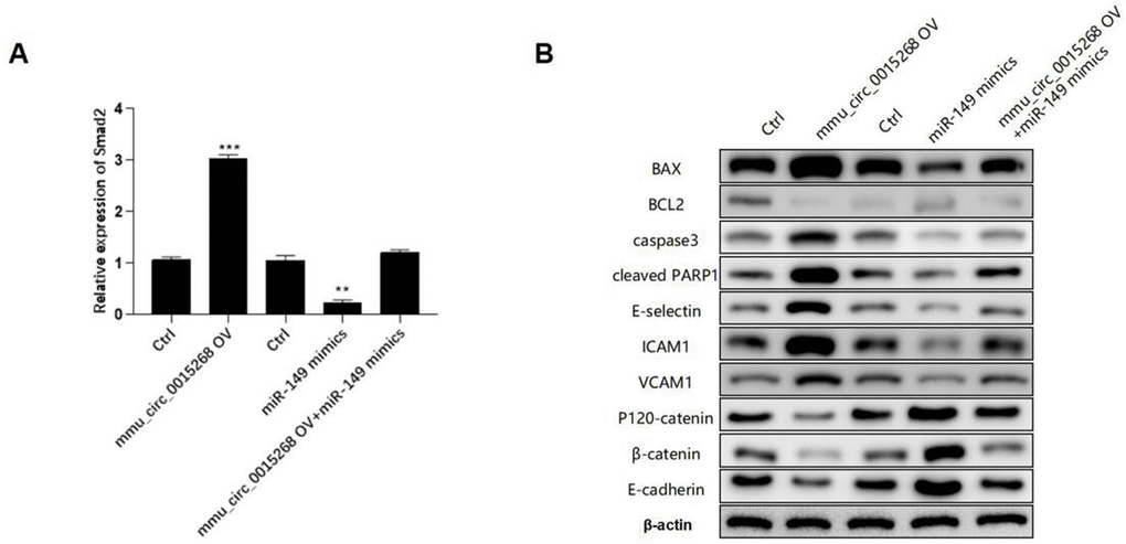 The expression of Smad2 was significantly enhanced by has_circ_0003091 overexpression and impaired by miR-149 overexpression in LPS-stimulated PMVECs. Moreover, the elevated Smad2 expression was suppressed by miR-149 mimics (Figure 7A), suggesting that has_circ_0003091 exerted its function by regulating the miR-149/Smad2 axis. Furthermore, the Western blot analysis showed that mmu_circ_0015268-induced apoptotic markers and endothelial activation were effectively restored by miR-149 overexpression, including BAX, BCL2, Caspase3, cleaved PARP1, E-selectin, ICAM1, VCAM1, P120-catenin, β-catenin, and E-cadherin in PMVECs (Figure 7B and Supplementary Figure 3). These results suggested that mmu_circ_0015268 promoted LPS-stimulated apoptosis and inflammation via the miR-149/Smad2 axis in PMVECs.