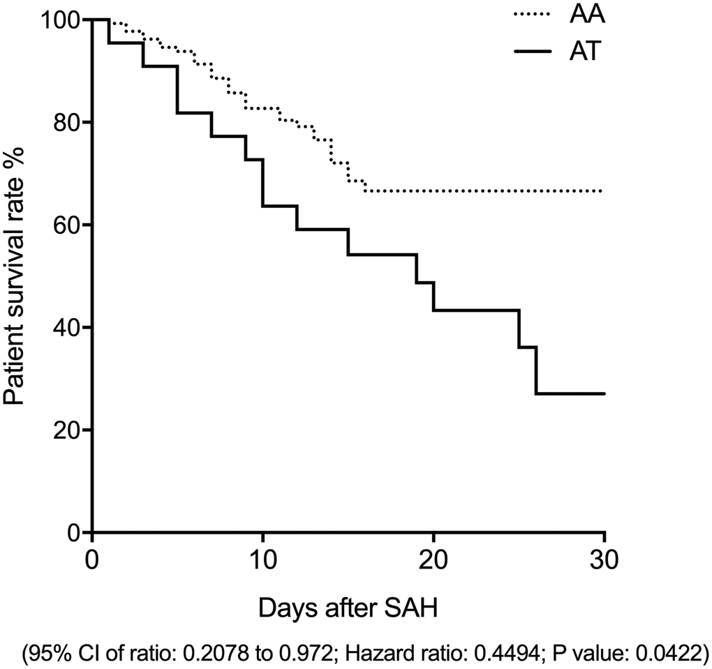 The survival rate was remarkably elevated in SAH patients carrying the AA genotype of rs17427875
