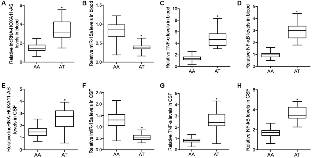 The expression of lncRNA-HOXA11-AS, miR-15a, TNF-α and NF-κB was further analyzed in the CSF collected from SAH patients carrying different genotypes of rs17427875. The expression of lncRNA-HOXA11-AS was notably increased in the CSF of SAH patients carrying the AT allele of rs17427875 when compared with the patients carrying the AA allele (Figure 2E). On the contrary, the expression of miR-15a was remarkably suppressed in the CSF of SAH patients carrying the AT genotype in comparison to patients carrying the AA genotype of rs17427875 (Figure 2F). The expression of TNF-α (Figure 2G) and NF-κB (Figure 2H) was apparently increased in the CSF of SAH patients carrying the AT genotype.