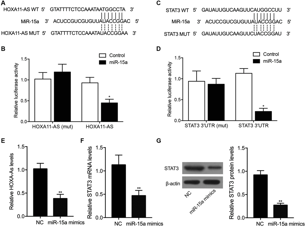 The luciferase activity of lncRNA-HOXA11-AS and STAT3 was suppressed by miR-15a in THP-1 cells