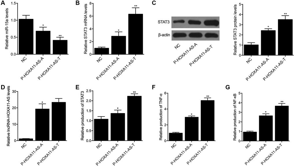 In order to further explore the regulatory relationship among lncRNA-HOXA11-AS, miR-15a and STAT3, P-HOXA11-AS-A and P-HOXA11-AS-T were transfected into THP-1 cells, respectively. The expression of miR-15a and STAT3 was examined in THP-1 cells transfected with P-HOXA11-AS-A and P-HOXA11-AS-T. The expression of miR-15a in THP-1 cells transfected with P-HOXA11-AS-A was remarkably suppressed when compared with the THP-1 cells transfected with the NC control. Moreover, the suppression of miR-15a expression was even more apparent in THP-1 cells transfected with P-HOXA11-AS-T (Figure 4A). On the contrary, the expression of STAT3 mRNA (Figure 4B) and protein (Figure 4C), as well as the expression of lncRNA-HOXA11-AS (Figure 4D), was progressively increased in THP-1 cells transfected with P-HOXA11-AS-A and P-HOXA11-AS-T.