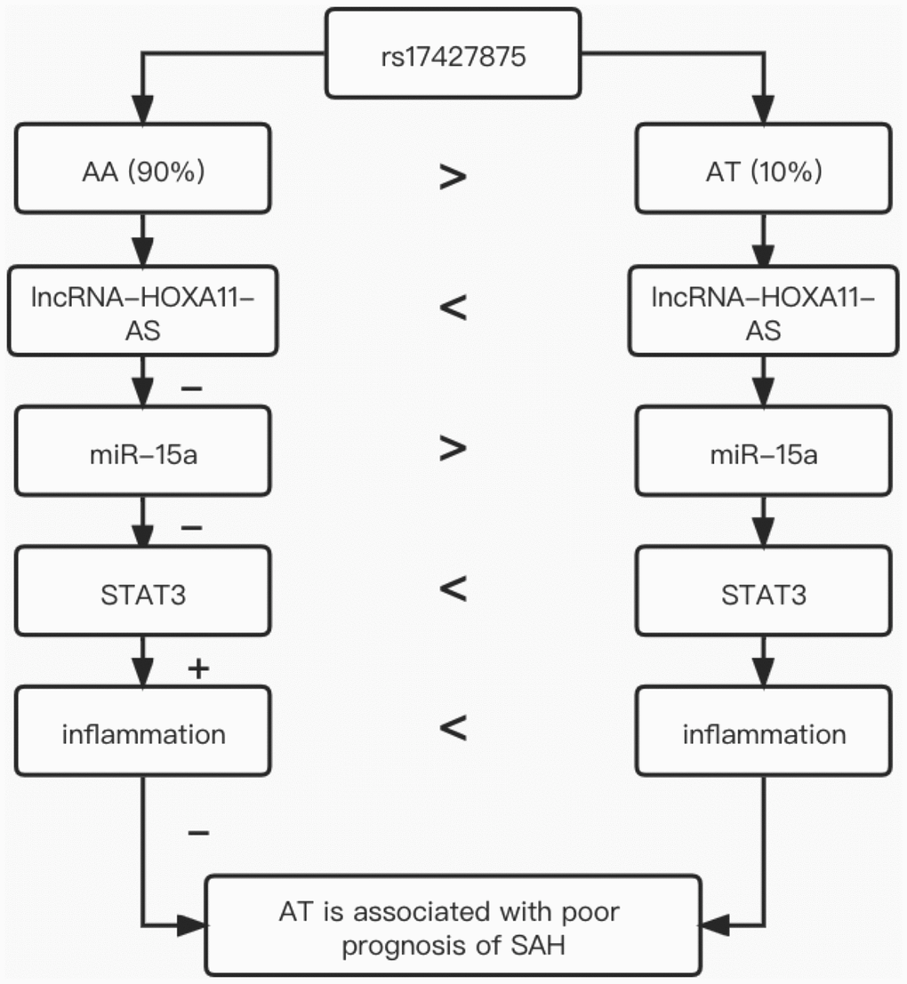 In conclusion, this study demonstrated that the minor allele of rs17427875 in lncRNA-HOXA11-AS could increase the expression of lncRNA-HOXA11-AS, thus elevating the expression of STAT3 mRNA and protein via down-regulating miR-15a expression, and increased STAT3 expression could aggravate inflammation to cause poor prognosis of SAH (Figure 5). Therefore, the rs17427875 polymorphism can be used as a potential biomarker for the prognosis of SAH.