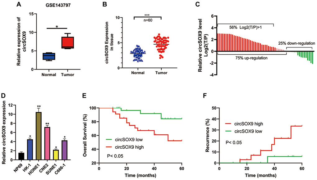 According to reports, many genes produce individual circRNAs in different cells, but their biological functions are unclear. With the development of high-throughput RNA sequencing and bioinformatics analysis, the distribution map of human circRNAs in different cells and tissues has been published. Studies have shown that abnormally expressed circRNAs is related to clinical characteristics and may become a biomarker of tumor occurrence and development. In this study, we found that the circular RNA from the SOX9 exon (named circSOX9) was significantly up-regulated in NPC tissues and the high expression of NPC was positively correlated with the progress of NPC.