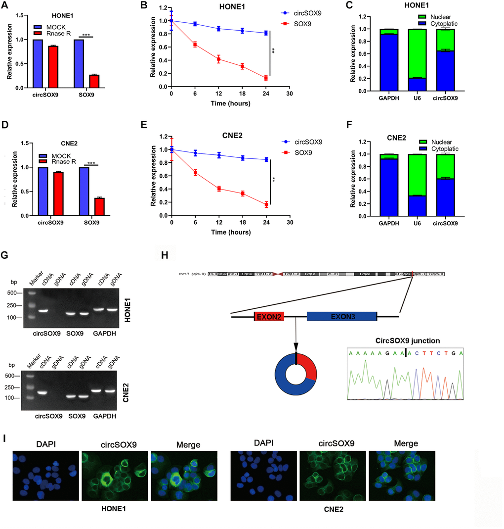 Before delving into the function of circSOX9 in NPC, it is necessary to investigate the characteristics of circSOX9. In the HONE1 cell line, circSOX9 is resistant to RNase R, while mSOX9 is significantly inhibited after RNase R treatment (Figure 2A, 2B). The analysis of cytoplasm and nuclear separation showed that most of circSOX9 were distributed in the cytoplasm (Figure 2C). We further repeated the above experiment in CNE2 (Figure 2D–2F). Figure 2G shows that circSOX9 was amplified by divergent primers, only from cDNA and not from gDNA.