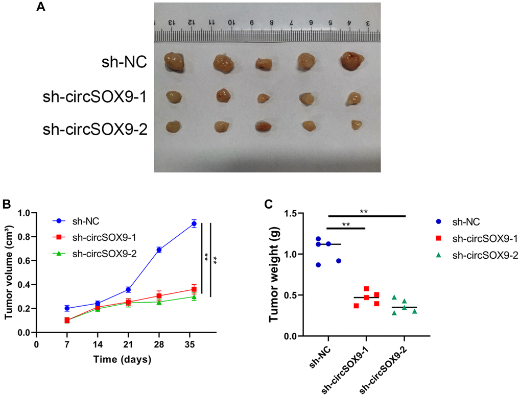 To investigate the functional role of circSOX9 in NPC cells, circSOX9 shRNA was constructed and transfected the plasmid into HONE1 and CNE2 cells. Use qRT-PCR to verify transfection efficiency (Figure 3A). Then the CCK8 assay was used to determine the proliferation ability after knocking down circSOX9 in HONE1 and CNE2 cells. Figures 3B, 3C show that knocking down circSOX9 significantly inhibits cell proliferation. Similar results were shown in the clone formation experiment, indicating that knocking down circSOX9 significantly inhibited the proliferation of HONE1 and CNE2 cells (Figure 3D). Figure 3E shows the invasion and migration ability of HONE1 cells measured by transwell assay. The results show that knocking down circSOX9 significantly inhibits the invasion and migration ability of HONE1 cells. Western blot analysis of markers related to epithelial-mesenchymal transition (EMT) showed that knocking down circSOX9 significantly inhibited the expression of Vimentin, N-cadherin, Twist1 (Figure 3F). Immunofluorescence analysis indicated that knocking down circSOX9 significantly inhibited the expression of Vimentin, N-cadherin in NPC cell (Figure 3G). In vivo experiment, we found that the growth ability of HONE cell was significantly inhibited in circSOX9 knockdown group (Figure 4A), and the volume and weigh also decreased compared to the control group (Figure 4B, 4C). The above data shows that circSOX9 can promote the proliferation and migration of NPC cells.