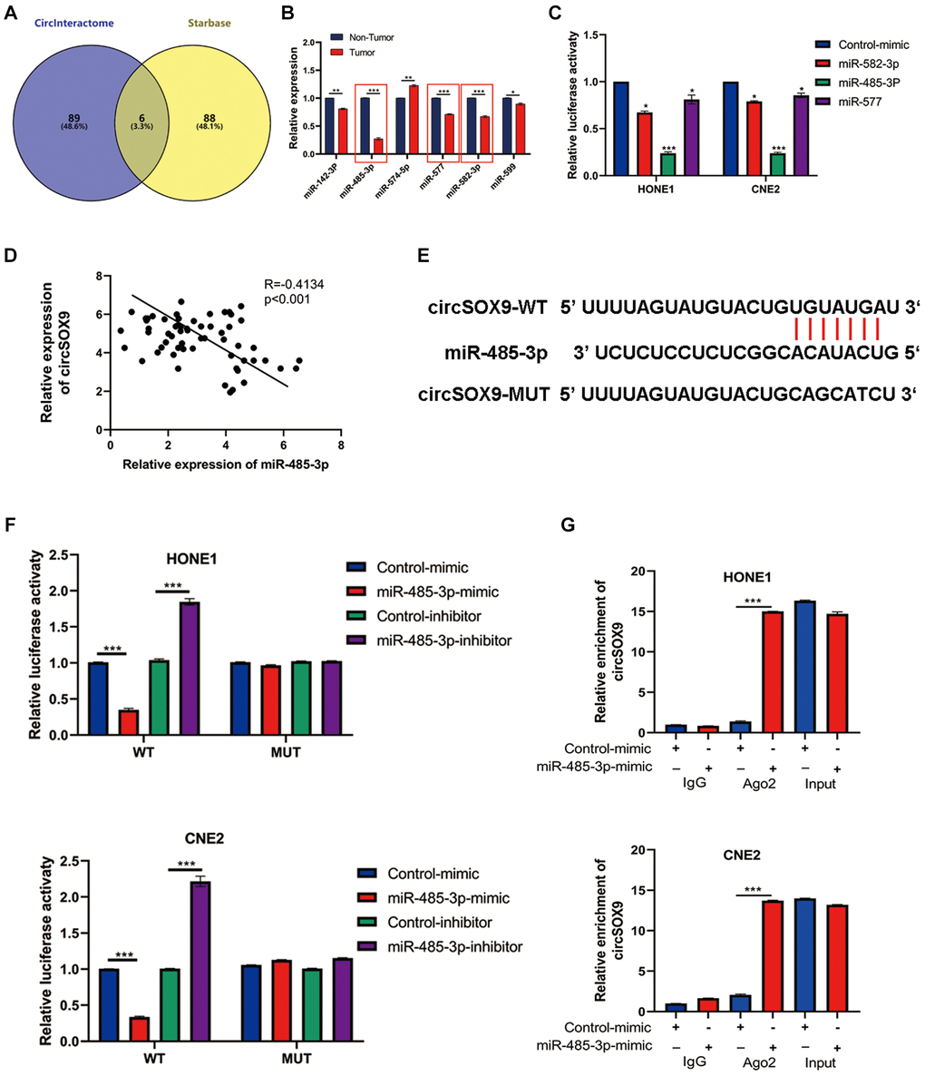 Predictive software (CircInteractome, Starbase) was used to screen out potential circSOX9 target genes. Six miRNAs were selected as putative target genes for follow-up studies (Figure 5A). Among the 6 miRNAs, we found that miR-485-3p, miR-577, and miR-582-3p were significantly downregulated in NPC tumor tissues (Figure 5B). The data from the luciferase assay suggested that the miR-485-3p could inhibit the luciferase activity of circSOX9 3′UTR (Figure 5C). Subsequently, qRT-PCR was used to detect the expression of miR-485-3p and circSOX9 in NPC tissues, then Person analysis of the expression levels indicated that circSOX9 and miR-485-3p were negatively correlated in NPC tissues (Figure 5D). Bioinformatic analysis indicated that miR-485-3p was downregulated and positive correlation with NPC prognosis based on GEO database (Supplementary Figure 1). Data from luciferase assay showed that miR-485-3p could combine with circSOX9 both in HONE1 and CNE2 cells (Figure 5E, 5F). The RIP test shows that Ago2 can bind to circSOX9 and miR-485-3p, indicating that these two can act on Ago2 (Figure 5G). Together, these results indicate that circSOX9 perhaps sponge miR-485-3p both in HONE1 and CNE2 cells.