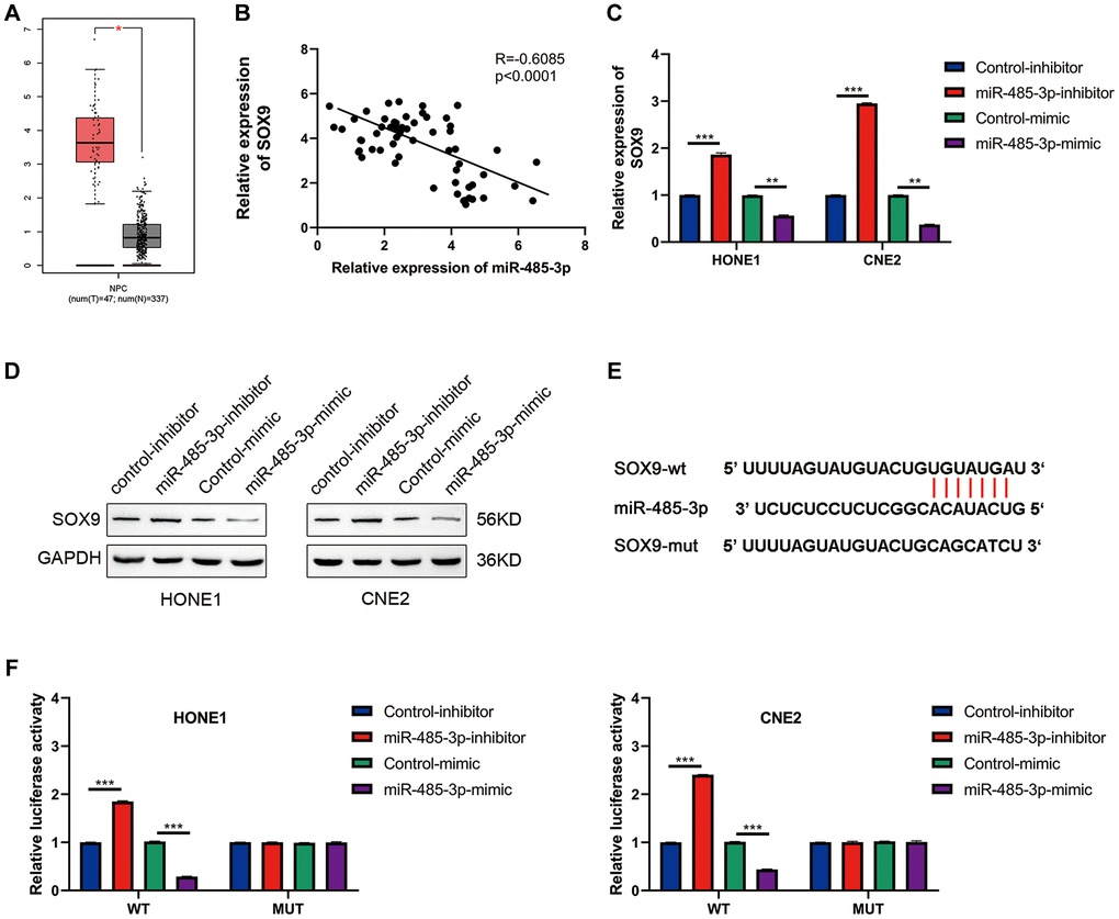 After analyzing NPC using the TCGA database, we found that SOX9 was up-regulated in NPC tissues (Figure 6A). Further analysis showed that SOX9 and miR-485-3p were negatively correlated in NPC tissues (Figure 6B). Data from western blot and qRT-PCR assay showed that miR-485-3p may inhibit SOX9 expression in HONE1 and CNE2 cells (Figure 6C, 6D). Then we found the binding site of miR-485-3p and SOX9 through bioinformatics analysis and constructed a luciferase mutant plasmid based on the binding site (Figure 6E). Data from luciferase assay showed that miR-485-3p could bind with SOX9 3′UTR (Figure 6F). Together, these data indicated that SOX9 was the target of miR-485-3p in NPC cells.
