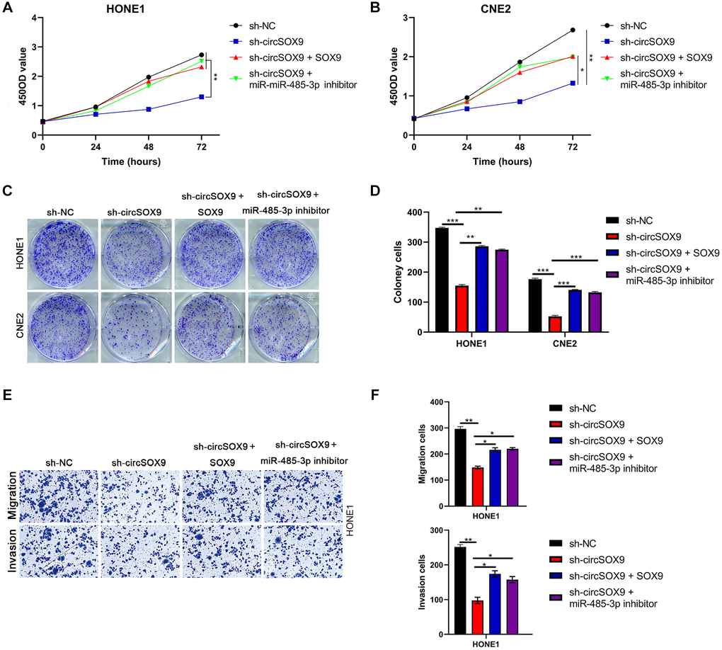 To further verify the existence of circSOX9/miR-485-3p/SOX9 axis in NPC cells. HONE1 or CNE2 cells were then transfected with sh-circSOX9 and miR-485-3p inhibitor or SOX9 overexpression plasmid. Data from plate colony and CCK8 assay showed that sh-circSOX9 can inhibit the proliferation of NPC cells, while miR-485-3p inhibitor and SOX9 overexpression plasmid can partially reverse the effect of sh-circSOX9 (Figure 7A–7D). Data from the transwell assay showed that invasion and migration of HONE1 cells were down-regulated after knocking down circSOX9 and rescued by transfection with miR-485-3p inhibitor or SOX overexpression plasmid (Figure 7E, 7F). Meanwhile, in cells with knockdown of miR-485-3p, the up-regulation of SOX9 by circSOX9 was suppressed (Supplementary Figure 2).