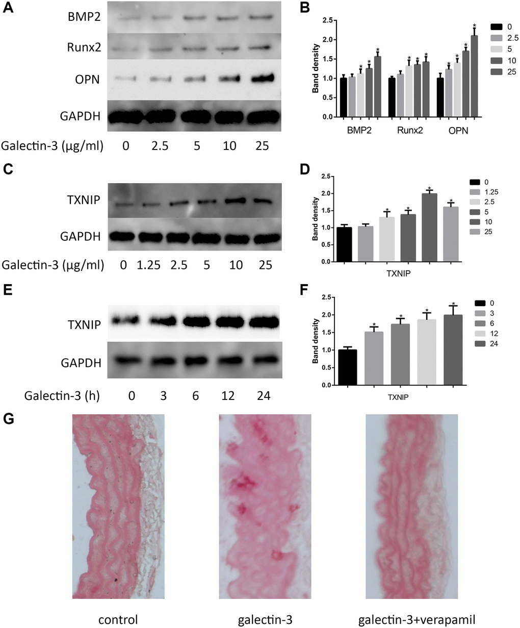 In order to investigate the effects of galectin-3 on VSMCs calcification, VSMCs were cultured in DMEM without serum for 12 h, after that, the serum-starved VSMCs were treated with different concentration of galectin-3 for 24 h, we observed the expression of osteogenic markers, including BMP2, Runx2 and OPN. As shown in Figure 1A and 1B, the expression of BMP2, Runx2 and OPN was upregulated after galectin-3 treatment. As TXNIP, an important protein of inflammation, may also participate in vascular calcification [7], we observed TXNIP expression after the treatment of different concentration of galectin-3 (0, 1.25, 2.5, 5, 10 and 25 μg/ml), 10 μg/ml galectin-3 most effectively increased TXNIP expression. We then used 10 μg/ml galectin-3 to deal with VSMCs for different times, TXNIP was obviously upregulated by galectin-3 treatment for 3 h, and was increased significantly until 24 h galectin-3 treatment (Figure 1C–1F). Since TXNIP was also increased after galectin-3 treatment, we next determined the effect of TXNIP in galectin-3-induced aorta and VSMCs calcification. In vivo, we injected verapamil and (or) galectin-3 into mice and observed calcium deposition in aortic tissues via Alizarin Red Staining. There was no calcified deposition in aortas of control group, galectin-3 significantly increased positive staining among elastic fibers of aortal media. Verapamil, a TXNIP inhibitor, effectively decreased galectin-3-induced artery calcification (Figure 1G).