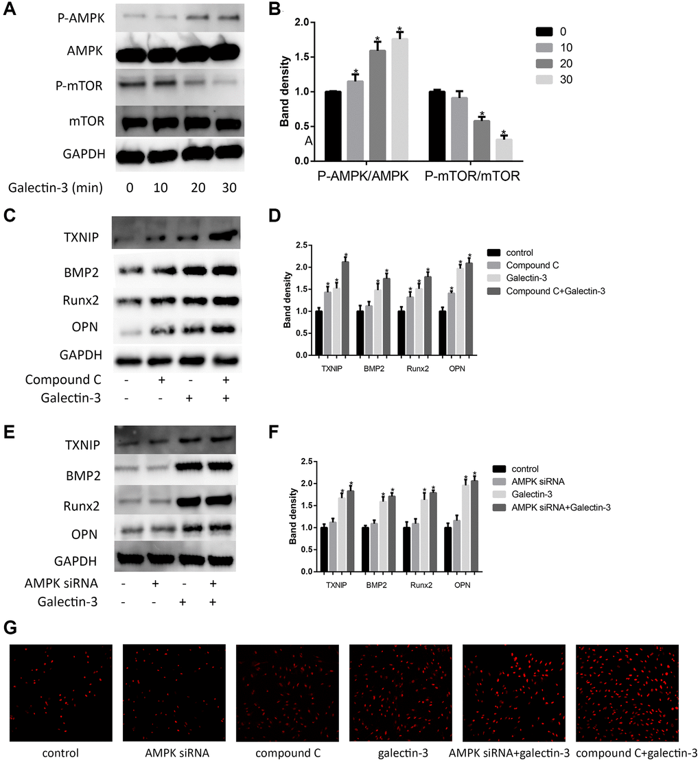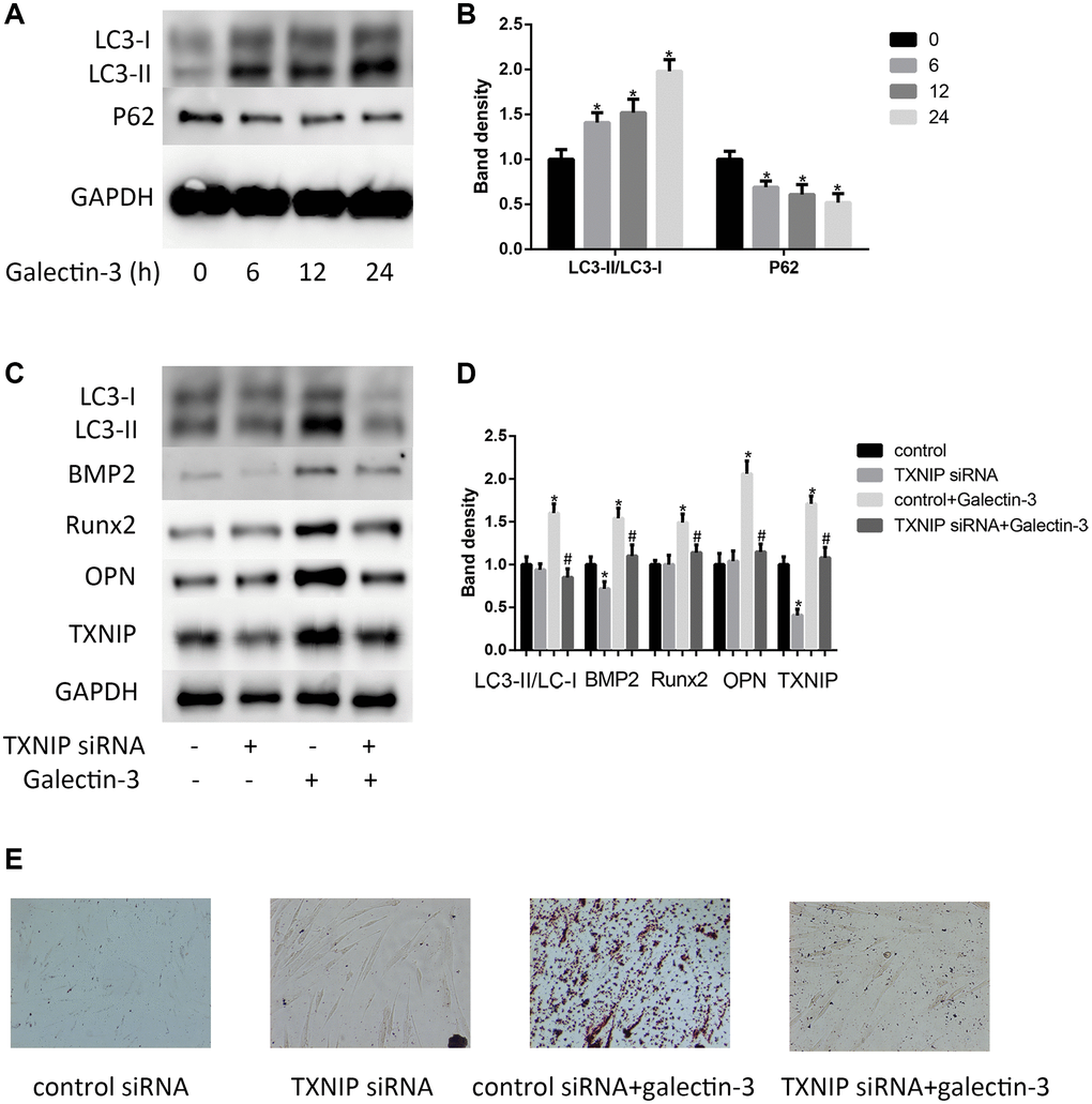 The Dulbecco’s Modified Eagle’s Medium (DMEM), fetal bovine serum (FBS) and penicillin/streptomycin were purchased from Gibco (Carlsbad, CA, USA). Galectin-3 and compound C (AMPK inhibitor) were purchased from Abcam (Cambridge, UK). 3-MA was obtained from Sigma Aldrich (St. Louis, MO, USA). Verapamil was purchased from Hefeng Pharmaceutical (Shanghai, China). The primary antibody against phospho-AMPK, AMPK, phospho-mTOR, mTOR and GAPDH were acquired from the Cell Signaling Technology Inc (Danvers, MA, USA). The primary antibodies against TXNIP, LC3B and Runx2 purchased from Sigma-Aldrich (St. Louis, MO, USA). Anti-galectin-3, anti-P62, anti-NLRP3, anti-caspase-1, anti-IL-1β, anti-OPN and anti-BMP2 were obtained from Abcam. All other chemicals were from commercial sources.