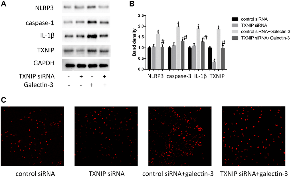 TXNIP binding to NLRP3 inflammasome is involved in regulating inflammation [14], besides, inflammation plays a key role in vascular calcification. In order to verify TXNIP effect on the expression of NLRP3 inflammasome (NLRP3 and caspase-1) and IL-1β in galectin-3 treatment VSMCs, the protein and mRNA level of NLRP3, caspase-1, and IL-1β were observed by using Western blot and qRT-PCR respectively. As shown in Figure 3A and 3B, galectin-3 significantly increased NLRP3, caspase-1, and IL-1β expression. The VSMCs with verapamil and galectin-3 treatment showed less expression of NLRP3, caspase-1, and IL-1β compared with galectin-3 treated VSMCs. The result was similar in Figure 3C, which showed increased ROS production after galectin-3 treatment was reversed by TXNIP siRNA treatment in VSMCs.