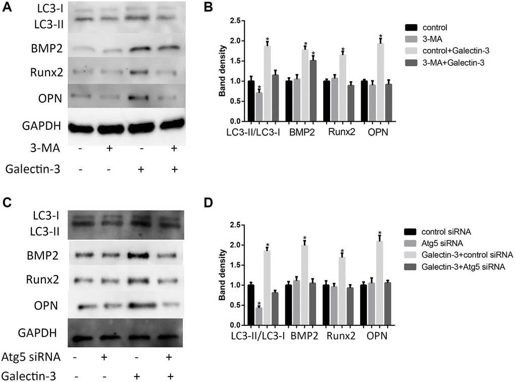 Until now, the role of autophagy in VSMCs osteogenic differentiation is still unclear, we would like to explore the relationship between autophagy and VSMCs osteogenic differentiation. We hypothesized that autophagy might mediate galectin-3-induced VSMCs differentiation. To test this hypothesis, we used autophagy inhibitors, 3-MA (100 mmol/L) or Atg5 siRNA, to treat VSMCs before galectin-3 stimulation. 3-MA or Atg5 siRNA not only effectively decreased the LC3-II protein expression (Figure 4A and 4B) but also inhibited galectin-3-induced upregulation of BMP2, Runx2 and OPN expression (Figure 4C and 4D).