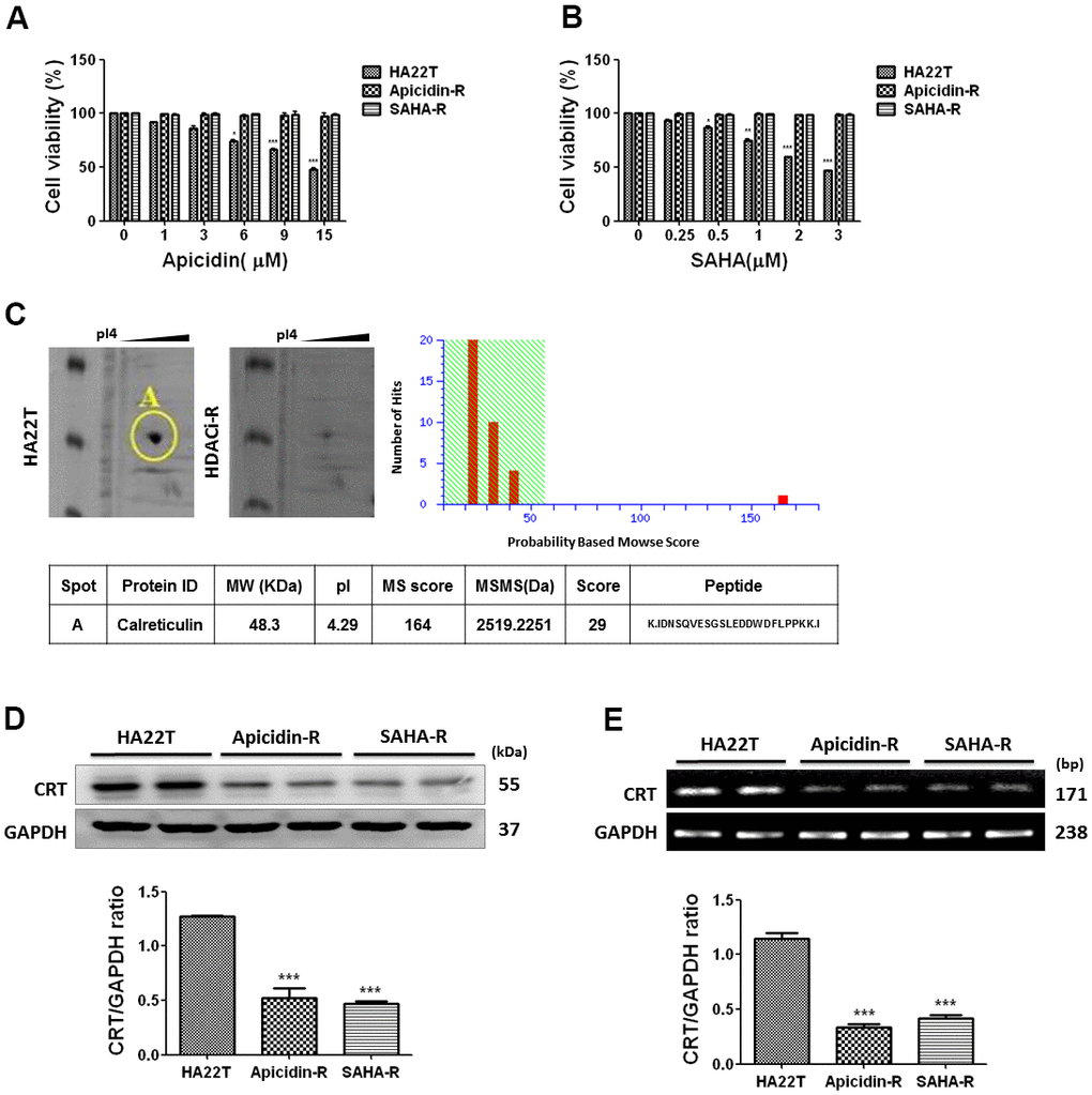 Following, we used two-dimensional gel electrophoresis (2-DE) to identify differentially expressed proteins, and selected a protein spot differential between HA22T and HDACis-R cells. The protein spot was analyzed by mass spectrometry and identified as calreticulin; it was significantly downregulated in the HDACis-R cells than in HA22T parental cells (Figure 1C). Furthermore, western blotting and qPCR analysis confirmed the downregulation of CRT in HDACis-R cells than in HA22T parental cells at protein and mRNA levels, respectively (Figure 1D, 1E). Therefore, we hypothesized that resistance to HDACis in HA22T cells correlated with downregulation of CRT.