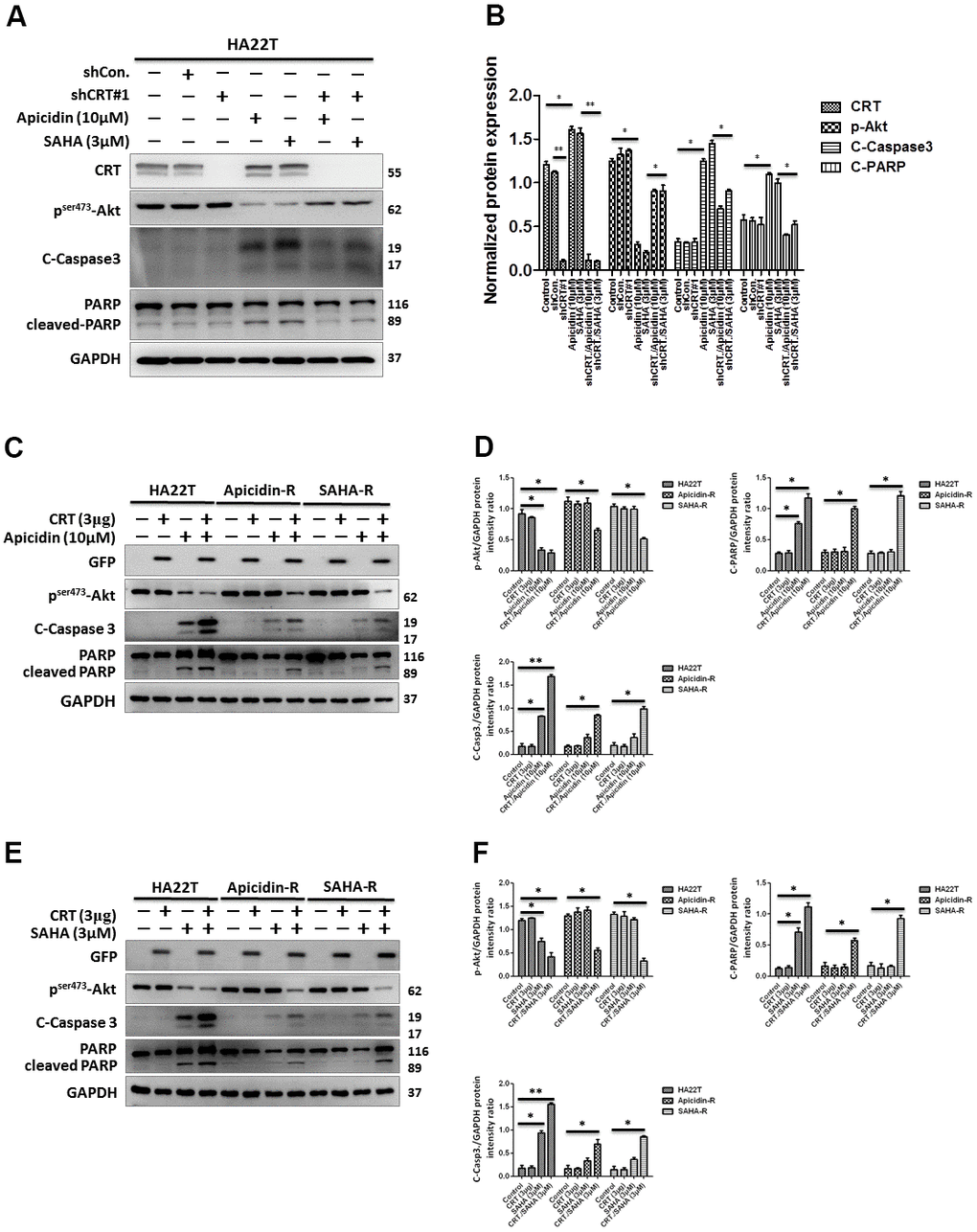 Recent studies have shown that CRT plays a crucial role during tumor development. Therefore, we hypothesized that HDACis-R in HA22T cells was developed either by upregulation or downregulation of CRT. We performed short hairpin RNA (shRNA)-mediated knockdown and plasmid-based overexpression of CRT to examine its role in HA22T and HDACis-R cells. The analysis showed that knockdown of CRT had no significant effect on HA22T cells. The HDACis suppressed p-Akt levels, but the expression of cleaved caspase 3, cleaved PARP, and CRT increased in HA22T cells. Moreover, knockdown of CRT rescued HDACis-induced apoptosis by reducing levels of cleaved caspase 3 and cleaved PARP, and increased p-Akt levels in HA22T cells (Figure 2A, 2B). In contrast, transient transfection with CRT-plasmid showed no effect on the levels of p-Akt, cleaved caspase 3, and cleaved PARP. However, overexpression of CRT enhanced HDACis-induced apoptosis between HA22T and HDACis-R cells via decreased levels of p-Akt, along with increased expression of cleaved caspase 3 or cleaved PARP (Figure 2C–2F). Additionally, studies have demonstrated that CRT could be modified [33], degraded [34], and translocated to the nucleus [35]. Therefore, we investigated that whether the posttranslational modifications in CRT could enhance chemosensitivity in HCC cells. First, we assessed the effect of MG132 on the viability of HA22T and HDACis-R cells using MTT assay. The analysis indicated that MG132 (10μM) significantly attenuated viability of liver cancer cells in 24–48 h (Supplementary Figure 1A). We treated liver cancer cells with MG132 (10μM) for 8 h that induced the accumulation of CRT and posttranslational modifications in CRT via polyubiquitination between HA22T and HDACis-R cells (Supplementary Figure 1B, 1C). Moreover, CRT ubiquitination increased in the HDACis-R cells than that in HA22T parental cells after treatment with MG132 (10 μM) for 8 h and subsequent immunoprecipitation (IP)/immunoblotting (IB) analysis (Supplementary Figure 1B, 1C). Nevertheless, after incubation with HDACis (10 μM of Apicidin or 3 μM SAHA) for 24 h and addition of MG132 at the 16th hour enhanced chemosensitivity in HA22T parental cells, especially in the HDACis-R cells (Supplementary Figure 1D, 1E). The results indicate that stress stimulates translocation of CRT that is upregulated and further induces cell apoptosis.