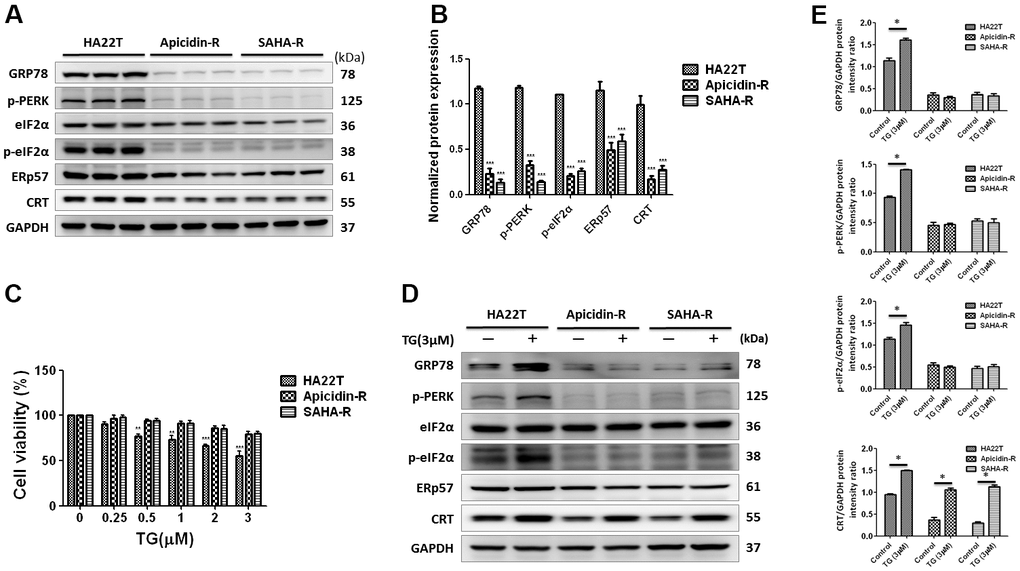 To explore the regulation of CRT expression by the ER stress pathway activity, we treated the HCC cells with ER stress activator, thapsigargin (TG) [38] for 24 h. The analysis showed that TG could significantly attenuate HA22T parental cell viability in a dose-dependent manner, but not in apicidin-R cells (Figure 3C). TG initiated apoptosis via activation of p-PERK, a protein functioning upstream to the ER stress in HA22T parental cells. Moreover, expression of GRP78, p-PERK, and p-eIF2α was upregulated in HA22T parental cells than that in HDACis-R (Figure 3D, 3E), consistent with our previous observations with fisetin-induced chemosensitivity in HCC cells [39].