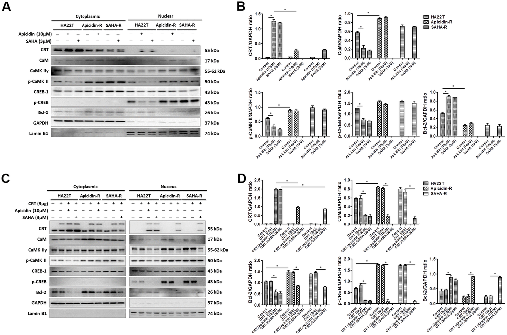 Calmodulin (CaM) is an intermediate for Ca2+-stimulated signaling cascades in many cell types. The Ca2+/CaM complex may activate a variety of enzymes and CaM Kinase (CaMK) family that control many cancer-related functions in several tumor types. Additionally, the CaMKII is a cancer marker that is frequently overexpressed and regulates cell proliferation, survival, invasion, and migration in various cancer types [31]. Our previous study demonstrated critical roles of CaM/CaMKII-γ pathway in the apicidin-persistent HCC prosurvival capability via ERK1/2/CREB/c-fos signaling activation [32]. These findings suggest that CaMKII-CREB is linked with differentiation, proliferation, apoptosis, and tumorigenicity; however, its role in the regulation of CRT remains unclear. Thus, we hypothesized that CRT may control drug-resistance in cancer cells by regulating the ER stress pathway or stimulating CRT translocation pathway. In the present study, CRT was overexpressed, which led to its translocation to the nucleus causing apoptosis in HCC cells treated with HDACis. The data showed that CRT was not regulated via ER stress pathway in HDACis-resistant HCC cells. Moreover, translocation of CRT, rather than its accumulation, led to apoptosis in HCC cells. These results indicate that CRT may serve as a target for developing anticancer therapeutics and preventive strategies by stimulating CRT translocation to the nucleus.