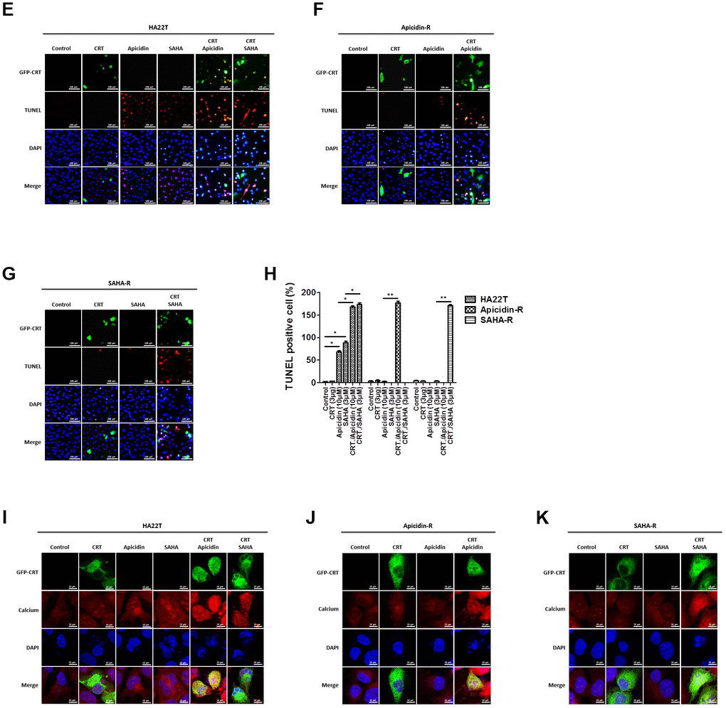 Cells were grown in 8-well chamber slides (MatTek; Ashland, MA, USA) and transfected with pCMV3-CALR-GFPSpark (Asia Bioscience Co. Ltd. HG13539-ACG) for 24 h, and treated with HDACis (10 μM apicidin or 3 μM SAHA) for 24 h. We measured apoptosis/ DNA damage in HA22T cells or HDACis-resistant cells using In Situ Cell Death Detection Kit and TMR red (Roche, Basel, Switzerland), according to the manufacturer’s instructions [79]. Fluorescence was visualized using a fluorescence microscope coupled to an image analysis system. Four microscopic fields were randomly-selected, and average counts of TUNEL-positive cells were calculated.