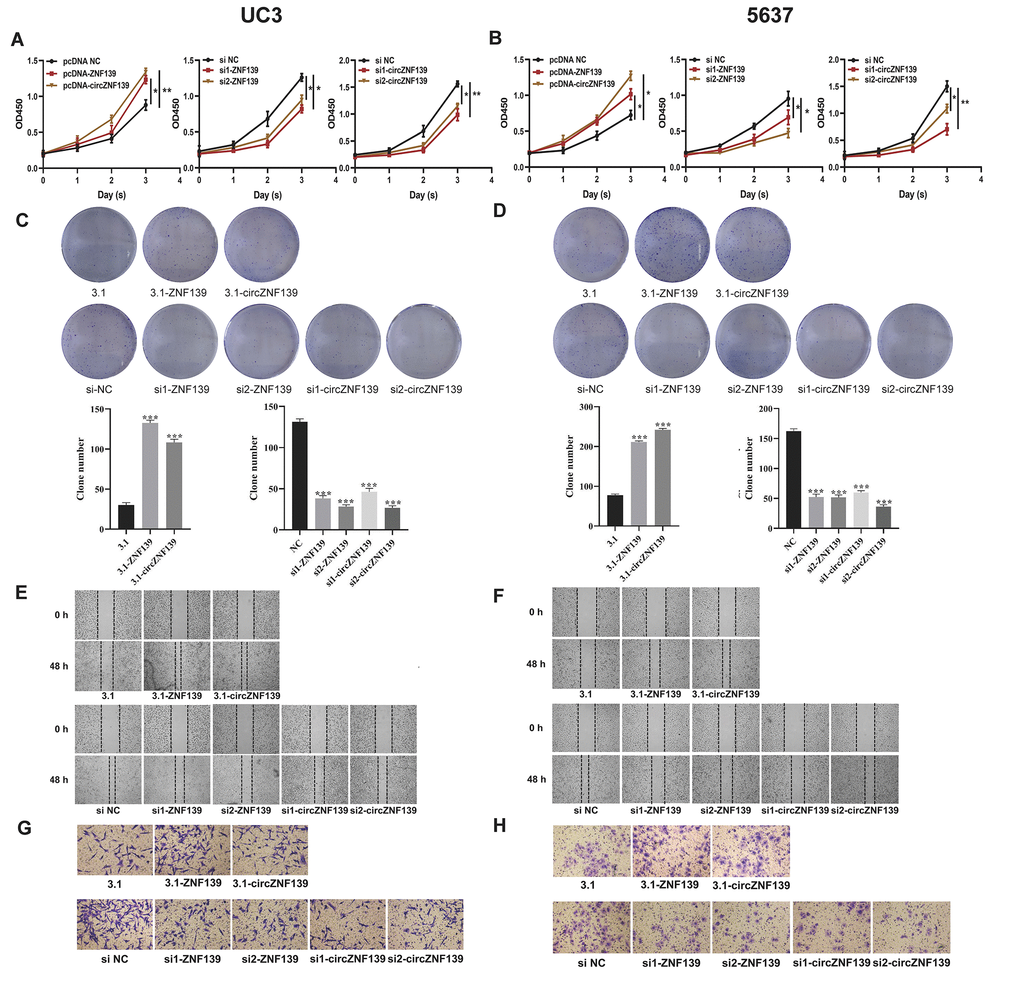 This article has been corrected: The authors noticed errors in Figure 6. As a result of misfiling the data, the images in panel 6C showing UC3 cells transfected with si1- and si2-circZNF139 were the same as the images in panel 6D showing 5637 cells transfected with si1- and si2-circZNF139. The authors corrected panels 6C and 6D in Figure 6 by using representative images from the original sets of experiments. Similarly, the images of cells obtained 48 h after si1-- and si2-circZNF139 transfection were mixed up during preparation of panel 6F and replaced. The images showing invasion by UC3 cells transfected with si1- and si2-ZNF139 were replaced in panel 6G, as was the image of 5637 cells transfected with 3.1 in panel 6H. All images were derived from the initial sets of experiments. The authors stated that these alterations do not affect the results or conclusions of this work and apologized for any inconvenience caused.