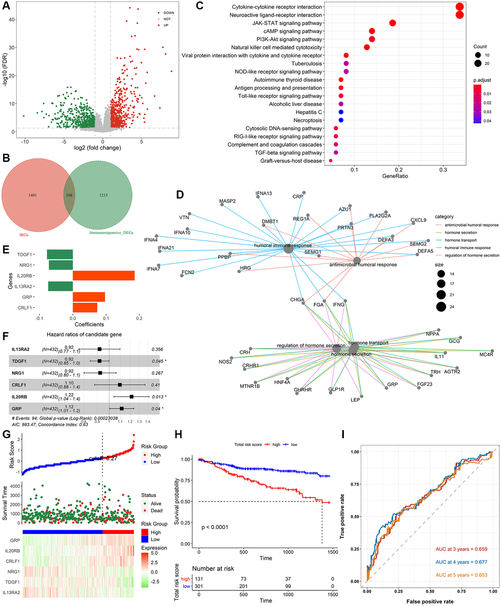 Figure 1 shows the whole analysis flow of this study. 1323 immunotherapeutic response-related DEGs (634 upregulated and 689 downregulated) were identified by comparing responders and non-responders in the anti-PD-L1 cohort (Figure 2A, Supplementary Table 4). After the intersection with 1509 IRGs, 108 IRIGs was obtained (Figure 2B, Supplementary Table 5). KEGG analysis results revealed that IRIGs were remarkably enriched in terms associated with Cytokine-cytokine receptor interaction, Neuroactive ligand-receptor interaction, JAK-STAT signaling pathway, cAMP signaling pathway, PI3K-Akt signaling pathway, and so on (Figure 2C). Furthermore, the GO enrichment analysis indicated that IRIGs mapped to hormone-related terms, including humoral immune response, antimicrobial humoral response, regulation of hormone secretion, and hormone transport (Figure 2D).