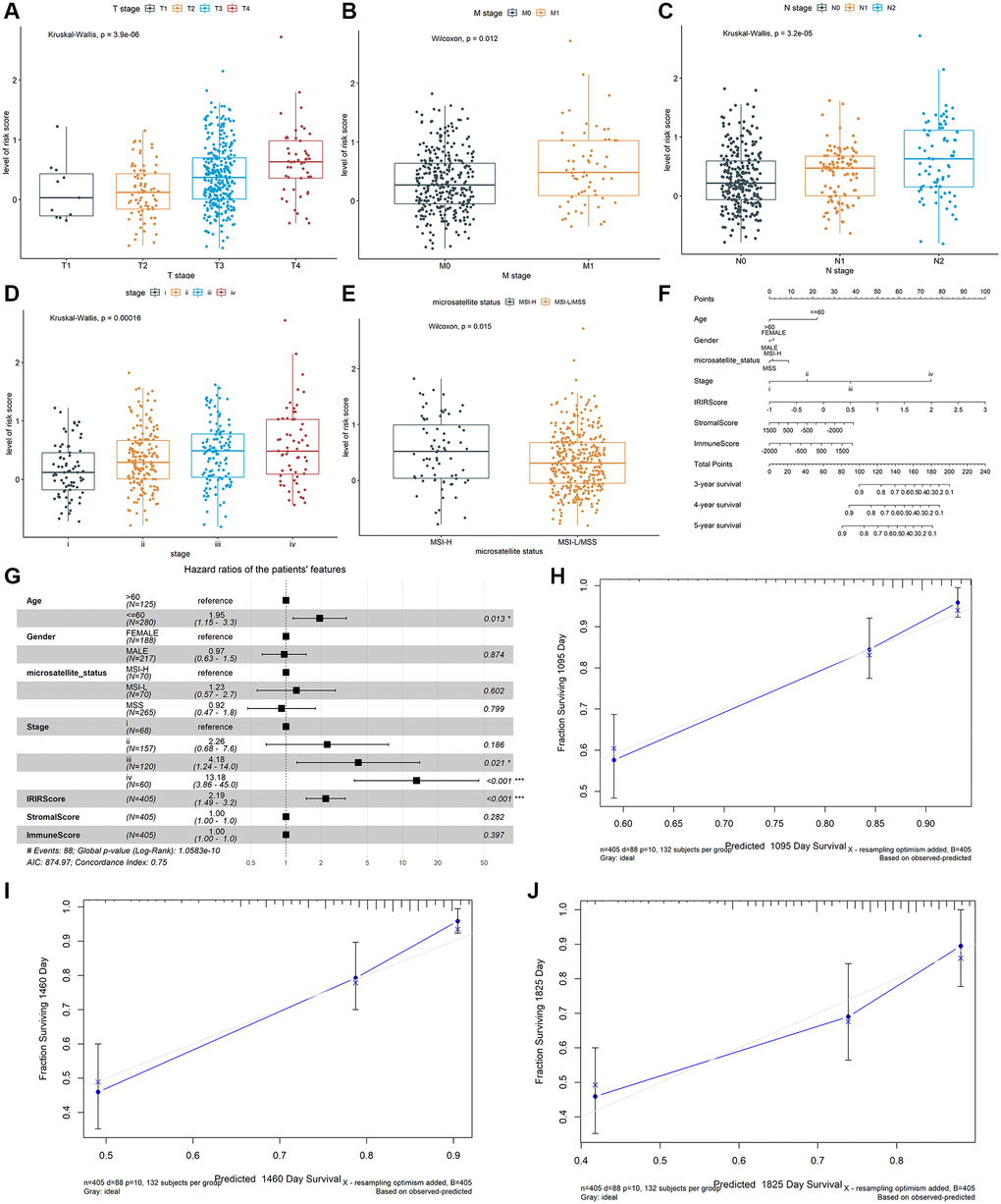 A prognostic nomogram was constructed to improve the accuracy of the performance of the IRIRScore model and to provide a quantitative and visual method for predicting 3-, 4-, and 5-years OS probability of patients with colon cancer. In the nomogram, it is easy to estimate the score for each variable on the point scale and calculate the probability of survival at 3-, 4-, 5-years (Figure 3F). Compared with the other variables, IRIRScore had the maximum score points. The forest plot shows that the variables, including the age (>60), advanced pathological stage (III and IV) and IRIRScore are significantly associated with OS (P < 0.05, Figure 3G), but the microsatellite status, StromalScore, and ImmuneScore are not (P > 0.05).