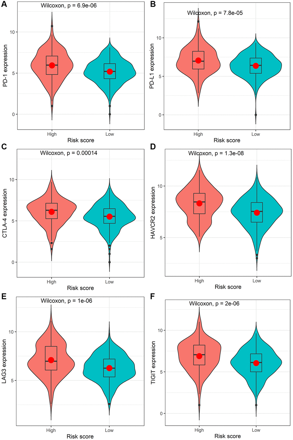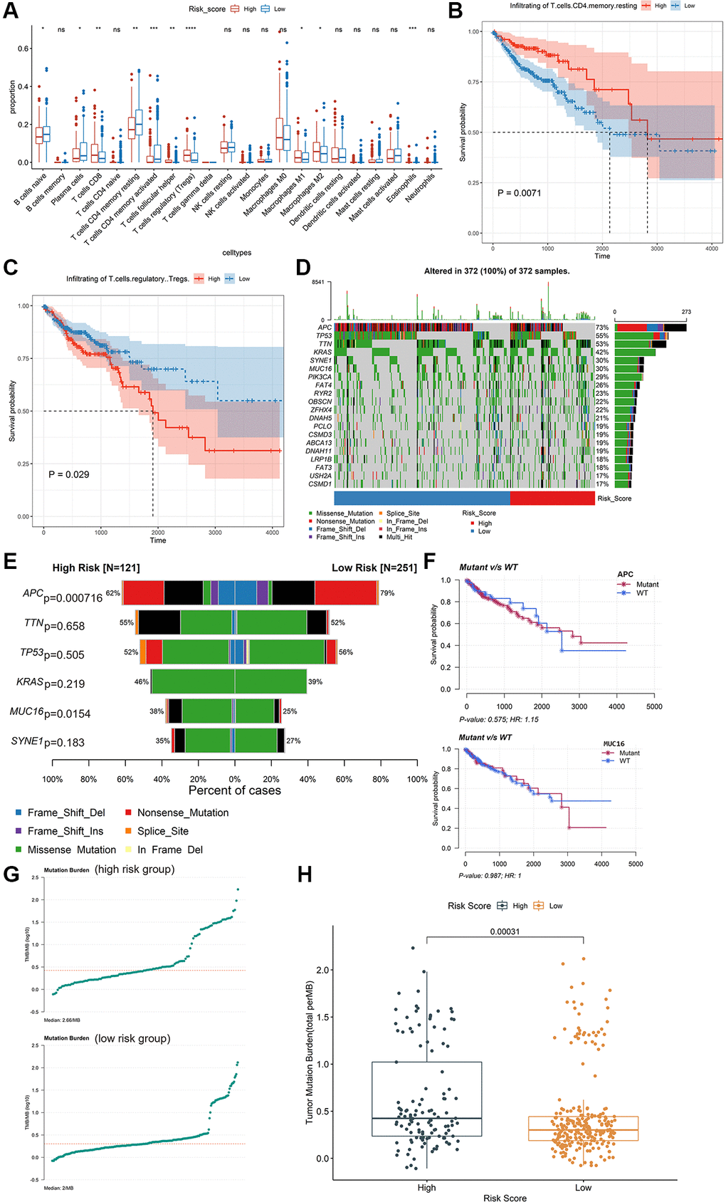 The identified immune-related signatures in predicting prognosis and TNM staging were validated in multiple cohorts, and displayed robust capability. Moreover, a nomogram was established based on the IRIRScore and other clinical characters, and the C-index of the nomogram was remarkably higher than the IRIRScore model. These findings may be helpful for the prognosis of patients with colon cancer. Additionally, we found that patients in the high-risk group had significantly higher expression level of immune checkpoint inhibitor targets than those in the low-risk group (Figure 5), suggesting that high-risk patients may respond better to immune checkpoint inhibitors targeting PD-1, PD-L1, CTLA-4, HAVCR2, LAG3, or TIGIT. Besides, higher TMB value (Figure 4H), more instability of the microsatellite status (Figure 3E), or a higher mutation rate of MUC16 (Figure 4E) are significantly associated with patients in the high-risk group, suggesting that those patients are more likely to benefit from immunotherapy. However, patients in the high-risk group exhibit a low mutation rate of APC (Figure 4E), suggesting that APC may be a tumor suppressor gene. In addition, patients with sensitive immunotherapeutic responsiveness may have a significantly better OS (Supplementary Figure 3C, 3E).