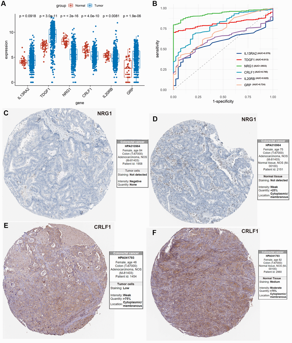 5 of 6 IRIGs were significantly differentially expressed between tumor and normal samples (P < 0.05, Figure 6A). Among them, TDGF1, and GRP were up-regulated in tumor samples, while NRG1, CRLF1, and IL20RB were down-regulated in tumor samples. The IRIGs were used to establish the prediction models with RF algorithm, and the AUC of each IRIG was calculated and plotted using the ggroc R package (IL13RA2: 0.579; TDGF1: 0.813; NRG1:0.933; CRLF1: 0.795; IL20RB: 0.625; GRP: 0.724, Figure 6B). Among them, TDGF1 and NRG1 revealed excellent diagnostic predictive performance (AUC >0.8). The distribution and expression of CRLF1, and NRG1 at the protein level are shown in Figure 6C–6F, whereas IL13RA2, TDGF1, IL20RB, and GRP remained inaccessible in HPA.