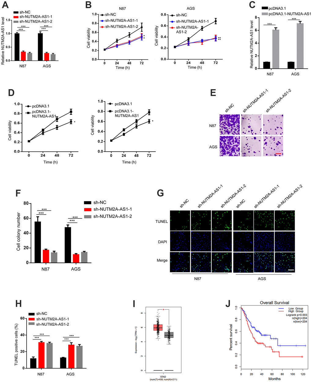 Next, we determined whether NUTM2A-AS1 was involved in the overall survival of patients with GC. By analyzing The Cancer Genome Atlas (TCGA) datasets, upregulated NUTM2A-AS1 expression was observed in tumor compared with non-tumor tissues (Figure 1I). Importantly, a low NUTM2A-AS1 level was associated with increased overall survival time (Figure 1J).