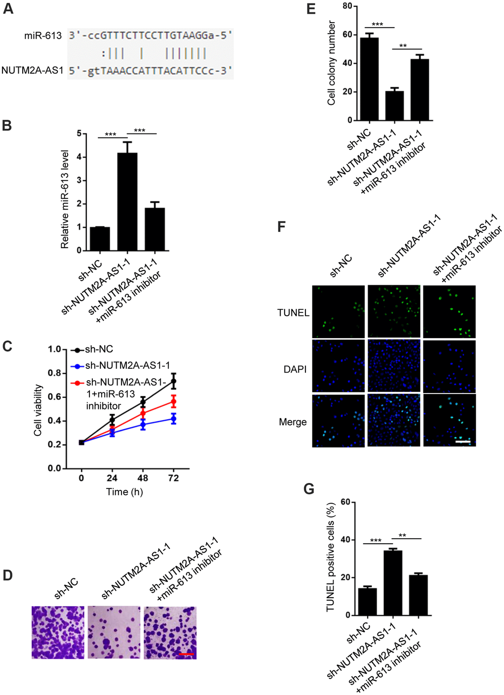 To determine the downstream miRNAs responsible for NUTM2A-AS1-mediated matrine resistance in GC cells, starBase v2.0 was used to identify miR-613 as a potential target of NUTM2A-AS1 (Figure 2A). NUTM2A-AS1 knockdown resulted in increased expression of miR-613 (Figure 2B). 3-(4,5-Dimethylthiazol-2-yl)-2,5-diphenyltetrazolium bromide (MTT) and cell colony formation assays demonstrated that NUTM2A-AS1 depletion impaired N87 cell viability and proliferation, respectively, following treatment with matrine. The miR-613 inhibitor rescued the impaired cell viability and proliferation (Figure 2C–2E). NUTM2A-AS1 depletion caused enhanced apoptosis of N87 cells under matrine treatment, which was rescued by the miR-613 inhibitor (Figure 2F, 2G). These findings indicate that miR-613 was critical for NUTM2A-AS1-regulated resistance of GC cells to matrine.