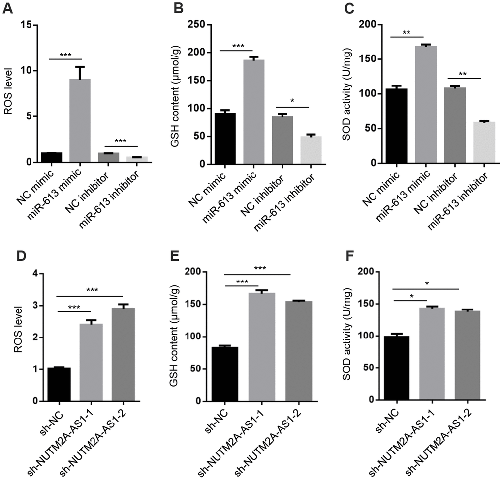A previous report showed that miR-613 modulated reactive oxygen species (ROS) in neuronal cells [27]. Based on this observation, we hypothesized that NUTM2A-AS1 and miR-613 may regulate oxidative stress signaling. The miR-613 mimic promoted ROS generation, and increased the glutathione (GSH) level and superoxide dismutase (SOD) activity, while the miR-613 inhibitor decreased ROS generation, the GSH level, and SOD activity in N87 cells treated with matrine (Figure 3A–3C). In addition, NUTM2A-AS1 knockdown increased ROS generation, the GSH level, and SOD activity in N87 cells treated with matrine (Figure 3D–3F). Taken together, these findings demonstrated that NUTM2A-AS1 and miR-613 regulated oxidative stress signaling in GC cells.
