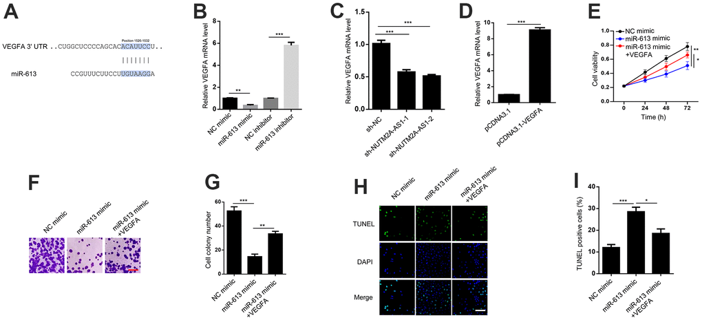 TargetScan software was used to predict the potential downstream effector of NUTM2A-AS1/miR-613 in GC (Figure 4A). The RT-qPCR results revealed that the miR-613 mimic suppressed, whereas the miR-613 inhibitor promoted, VEGFA expression (Figure 4B). These data were in agreement with previous findings [19, 28]. In addition, NUTM2A-AS1 knockdown attenuated the VEGFA expression level (Figure 4C).