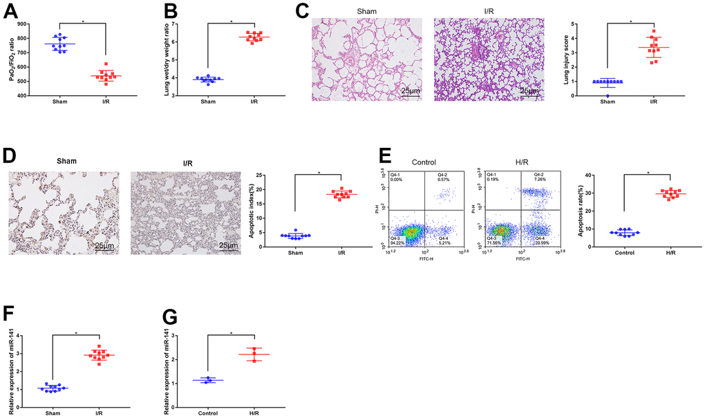 Firstly, I/R surgery was performed to construct the lung IRI mouse models, later, a blood gas analyzer was utilized for arterial blood gas analysis in mouse left ventricle. Then, we weighed lung tissues from mice on the electronic balance to determine W/D ratio, thus evaluating edema (Figure 1A, 1B). As a result, relative to sham operation group, I/R modeling mice had reduced PaO2/FiO2 ratio within left ventricle, whereas elevated lung tissue W/D ratio. As revealed by HE staining (Figure 1C) together with TUNEL staining (Figure 1D), relative to sham operation group, I/R modeling group had aggravated apoptosis and lung tissue injury, thus confirming that LIRI mouse models were successfully constructed. Later, we used mouse PMVECs to induce H/R models to conduct in vitro analysis. As revealed by flow cytometric analysis (Figure 1E), H/R-challenged cells showed increased apoptosis compared with the untreated cells, suggesting that H/R cell models were successfully induced. At last, we adopted RT-qPCR to measure miR-141 levels within I/R mouse lung tissues (Figure 1F) as well as H/R cells (Figure 1G). As a result, relative to controls, miR-141 levels within I/R lung tissues and H/R cells were up-regulated, thus confirming the high expression of miR-141 within LIRI cells and tissues.