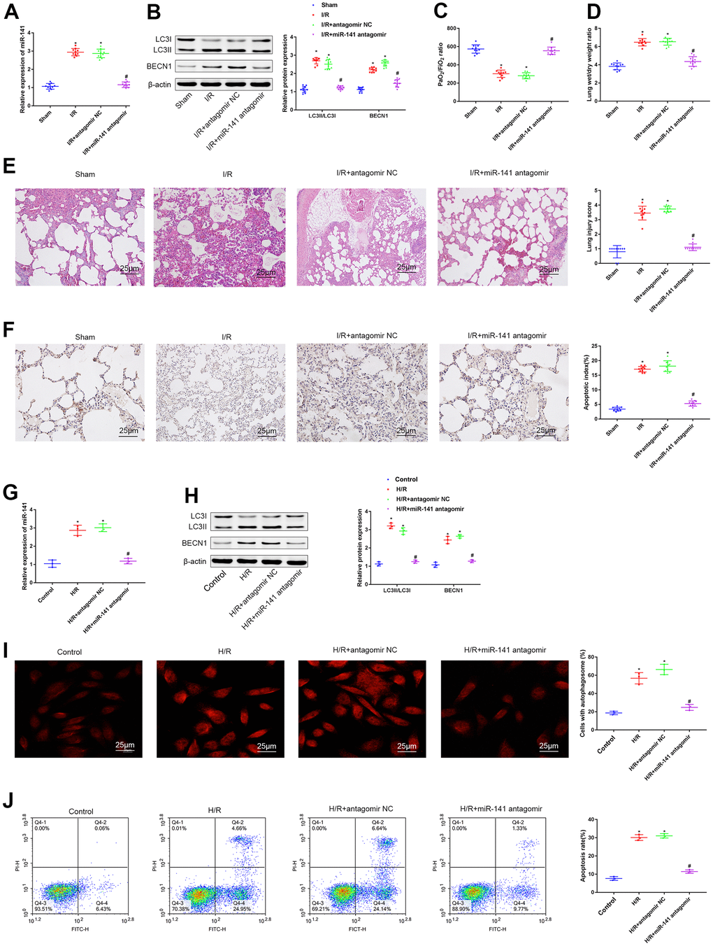 As shown above, miR-141 was up-regulated within LIRI cells and tissues. For understanding the function of miR-141 in autophagy during LIRI, we divided animals into sham operation group, miR-141 antagomir or antagomir NC transfection group, and I/R modeling group. As for PMVECs, they were treated with or without miR-141 antagomir or antagomir NC and later subjected to H/R treatment. Thereafter, we performed RT-qPCR analysis for analyzing miR-141 levels within lung tissues of IRI mice (Figure 2A). As a result, compared with sham operation group, miR-141 expression increased within lung tissues from IRI modeling group and IRI modeling + antagomir NC transfection group, but that decreased after miR-141 antagomir transfection. Thereafter, we measured the autophagy-related genes (ARGs, including BECN1 and LC3II/I) levels within lung tissues through WB assay (Figure 2B). As a result, relative to sham operation group, BECN1 expression and LC3II/I ratio elevated within lung tissues from IRI modeling group and IRI modeling+antagomir NC transfection group. Relative to I/R modeling+antagomir NC transfection group, BECN1 expression and LC3II/I ratio decreased after miR-141 antagomir transfection. Arterial blood gas analysis was conducted in mouse left ventricle by using the blood gas analyzer, then, edema was assessed through calculating W/D ratio (Figure 2C, 2D). As a result, relative to sham operation group, I/R modeling group and I/R modeling+antagomir NC transfection group had reduced PaO2/FiO2 ratio, whereas elevated lung tissue W/D ratio (p<0.05). Besides, I/R modeling+ miR-141 antagomir transfection mice showed increased PaO2/FiO2 ratio whereas decreased W/D ratio compared with I/R modeling mice receiving antagomir NC transfection (p<0.05). As suggested by HE staining (Figure 2E) as well as TUNEL staining (Figure 2F) results, relative to sham operation group, I/R modeling group and I/R modeling+antagomir NC transfection group had increased apoptosis and aggravated lung tissue injury, while miR-141 antagomir transfection mitigated cell injury and inhibited apoptosis. Consistent results were obtained from each cell experiment after transfection (Figure 2G–2J). As suggested by the above findings, miR-141 knockdown mitigated LIRI and inhibited autophagy in vitro and in vivo.