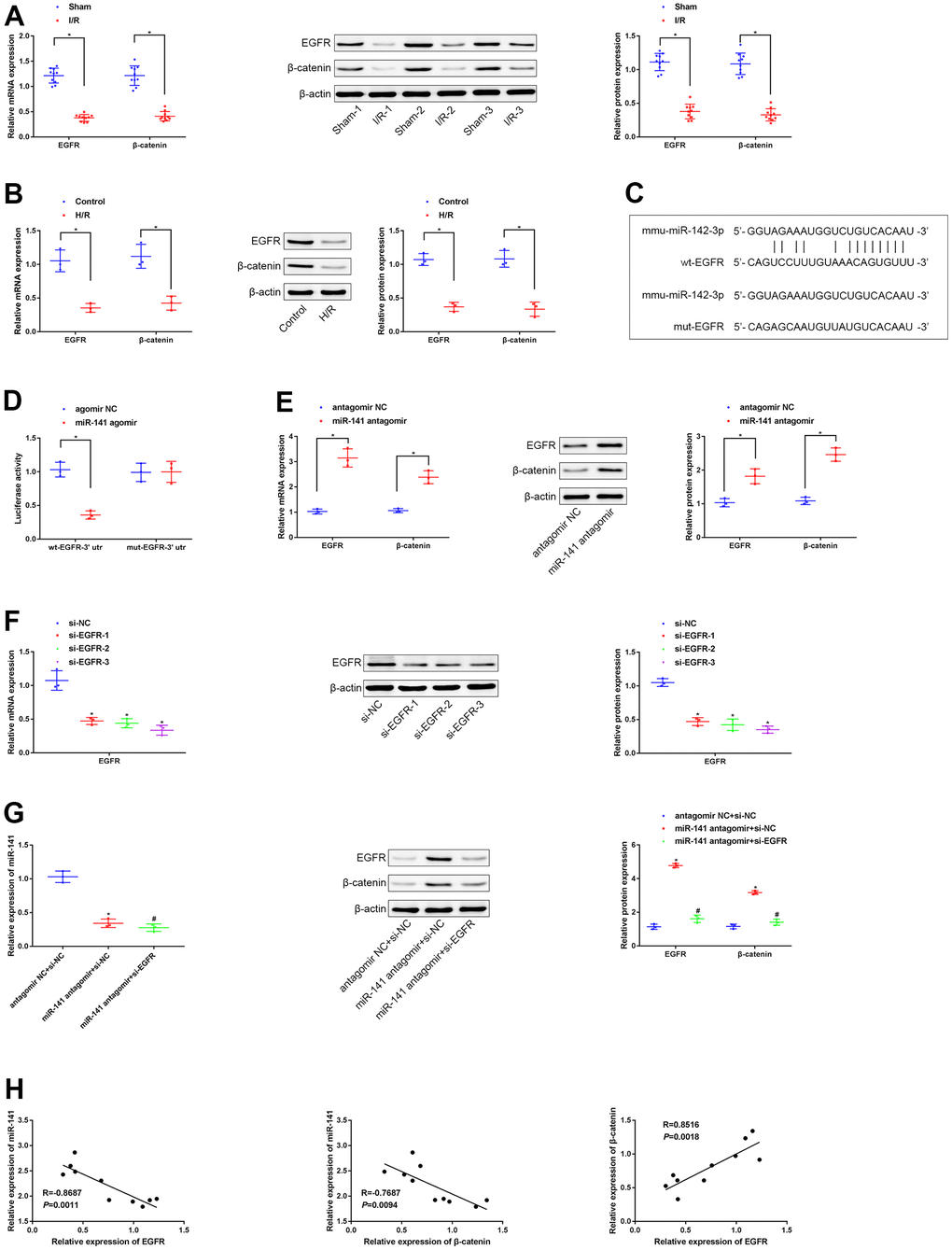 MicroRNAs (miRNAs) are the small endogenous non-coding RNAs that contain approximately 18-25 nucleotides, which function to modulate gene expression at translational and transcriptional levels. MiRNAs can specifically recognize and bind to the target mRNAs by forming the RNA-induced silencing complex (RISC), thus regulating the expression of specific genes [4]. In addition, miRNAs are suggested to exert vital parts in the modulation of diverse pathophysiological processes within mammals, and more than 50% of mammalian protein-coding genes are regulated by miRNAs. MiRNAs have been verified in many reports to participate in IRI, which mainly regulate cell proliferation, differentiation, apoptosis, autophagy, inflammation and immune response. Besides, there are many studies on the roles of miRNAs in in kidney, liver, brain and heart IRI [5–9]. Typically, miR-141 shows low expression in PC12 and H9C2 cells experiencing IRI, and it also aggravates IRI. We are interested in exploring the function and underlying mechanism by which miR-141 regulates LIRI [10, 11]. According to our bioinformatics analysis results at TargetScan website, miR-141 potentially targeted and suppressed the expression of epidermal growth factor receptor (EGFR). EGFR has been previously suggested to exert a vital part in cell growth, differentiation, autophagy and apoptosis, and it is also involved in some signaling pathways [12, 13]. Meanwhile, β-catenin is reported to be closely related to EGFR. Under the action of EGFR, β-catenin accumulates in the nucleus to induce cell proliferation; on the other hand, β-catenin can directly target EGFR and activate the downstream signaling pathways [14]. Moreover, the β-catenin signaling pathway possibly exerts a vital part in resisting IRI. Based on the above observations, the miR-141/EGFR/β-catenin axis is suggested to participate in LIRI occurrence [15]. In this study, we reported the damage of miR-141 against IRI in a mouse model and discovered that the inhibition of β-catenin signaling induced by EGFR constituted a critical mechanism.