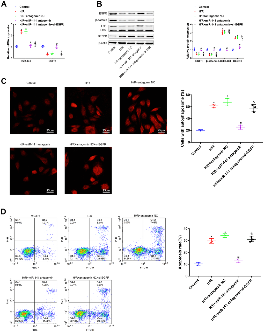 For investigating the function of miR-141/EGFR/β-catenin axis in autophagy during the H/R-mediated injury, we transfected PMVECs with or without miR-141 antagomir + si-EGFR, miR-141 antagomir, or antagomir NC, and later treated cells under H/R conditions. Firstly, EGFR and miR-141 expression levels were determined through RT-qPCR assay (Figure 4A). As a result, relative to non-H/R-exposed PMVECs, miR-141 level was up-regulated, whereas EGFR level was down-regulated in cells treated under H/R environment and in cells treated with H/R and antagomir NC simultaneously. Relative to mouse PMVECs subjected to H/R and antagomir NC treatment, miR-141 level decreased within mouse PMVECs subjected to H/R exposure combined with miR-141 antagomir+si-EGFR or miR-141 antagomir transfection, whereas EGFR level increased within mouse PMVECs exposed to H/R and miR-141 antagomir transfection. Relative to mouse PMVECs exposed to H/R and miR-141 antagomir transfection, EGFR level declined after transfection with miR-141 antagomir + si-EGFR. According to WB assay (Figure 4B), LC3 immunofluorescence analysis (Figure 4C) as well as flow cytometric analysis (Figure 4D), relative to non-H/R-exposed mouse PMVECs, β-catenin and EGFR levels declined within cells subjected to H/R exposure and cells subjected to H/R exposure plus antagomir NC transfection, while BECN1 level, LC3II/LC3I, apoptosis rate and autophagosomes increased. Compared with PMVECs subjected to H/R exposure and antagomir NC transfection, β-catenin and EGFR levels increased in cells exposed to H/R and miR-141 antagomir transfection, whereas BECN1 level, LC3II/LC3I, apoptosis rate and autophagosomes decreased. But further si-EGFR exposure had contrary findings. As a result, the miR-141/EGFR/β-catenin axis deteriorated injury to cells under H/R exposure through promoting autophagy.