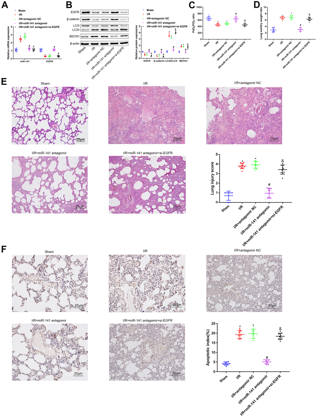 For investigating the role of miR-141/EGFR/β-catenin axis in autophagy during LIRI in vivo, we classified mice into sham operation group, miR-141 antagomir transfection group, antagomir NC transfection group, and miR-141 antagomir + si-EGFR transfection group; thereafter, all mice were treated under I/R environment. Firstly, EGFR and miR-141 levels within mouse lung tissues were measured through RT-qPCR (Figure 5A). As a result, relative to sham operation group, miR-141 level elevated in I/R-challenged mice as well as in I/R-challenged mice under antagomir NC transfection, whereas EGFR level reduced. Relative to I/R-challenged mice under antagomir NC transfection, miR-141 level decreased in I/R-challenged mice under miR-141 antagomir transfection and those under miR-141 antagomir + si-EGFR transfection, and EGFR level increased in I/R-challenged mice under miR-141 antagomir transfection. Relative to I/R-challenged mice under miR-141 antagomir transfection, EGFR level reduced in I/R-challenged mice under miR-141 antagomir+si-EGFR transfection. As shown by WB assay (Figure 5B), arterial blood gas analysis (Figure 5C), W/D ratio measurement (Figure 5D), HE staining (Figure 5E) together with TUNEL staining (Figure 5F) results, relative to sham operation group, β-catenin and EGFR levels and PaO2/FiO2 ratio decreased, whereas LC3II/LC3I ratio, W/D ratio, BECN1 level, apoptosis and lung tissue injury increased in I/R-challenged mice and in I/R-challenged mice under antagomir NC transfection. Relative to I/R-challenged mice under antagomir NC transfection, β-catenin and EGFR levels, together with PaO2/FiO2 ratio elevated, but LC3II/LC3I ratio, W/D ratio, BECN1 level, apoptosis and lung tissue injury decreased in I/R-challenged mice under miR-141 antagomir transfection. Besides, miR-141 antagomir combined with si-EGFR treatment led to contrary results compared with those obtained by miR-141 antagomir treatment alone. In conclusion, miR-141 targeted and suppressed EGFR level in LIRI tissues to suppress β-catenin level and suppressing β-catenin aggravated autophagy for aggravating LIRI in vivo.